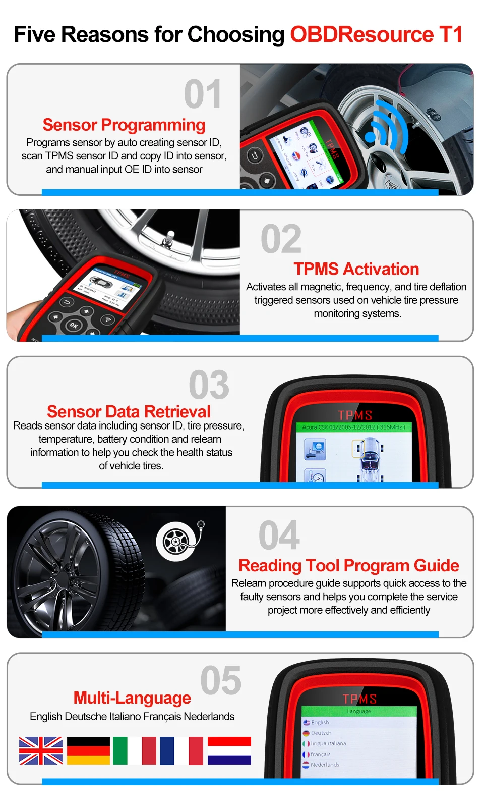 T1-это базовая модель TPMS нового поколения, которая предназначена для активации всех известных датчиков TPMS, считывания идентификатора датчика, давления, температуры и состояния батареи, программа OBDResource S1/S2-sensors и обеспечивает процедуру переобучения на инструменте. С большим цветным дисплеем, быстрой скоростью и обновленным программным обеспечением, T1 действительно является отличным компаньоном для вашей системы TPMS.