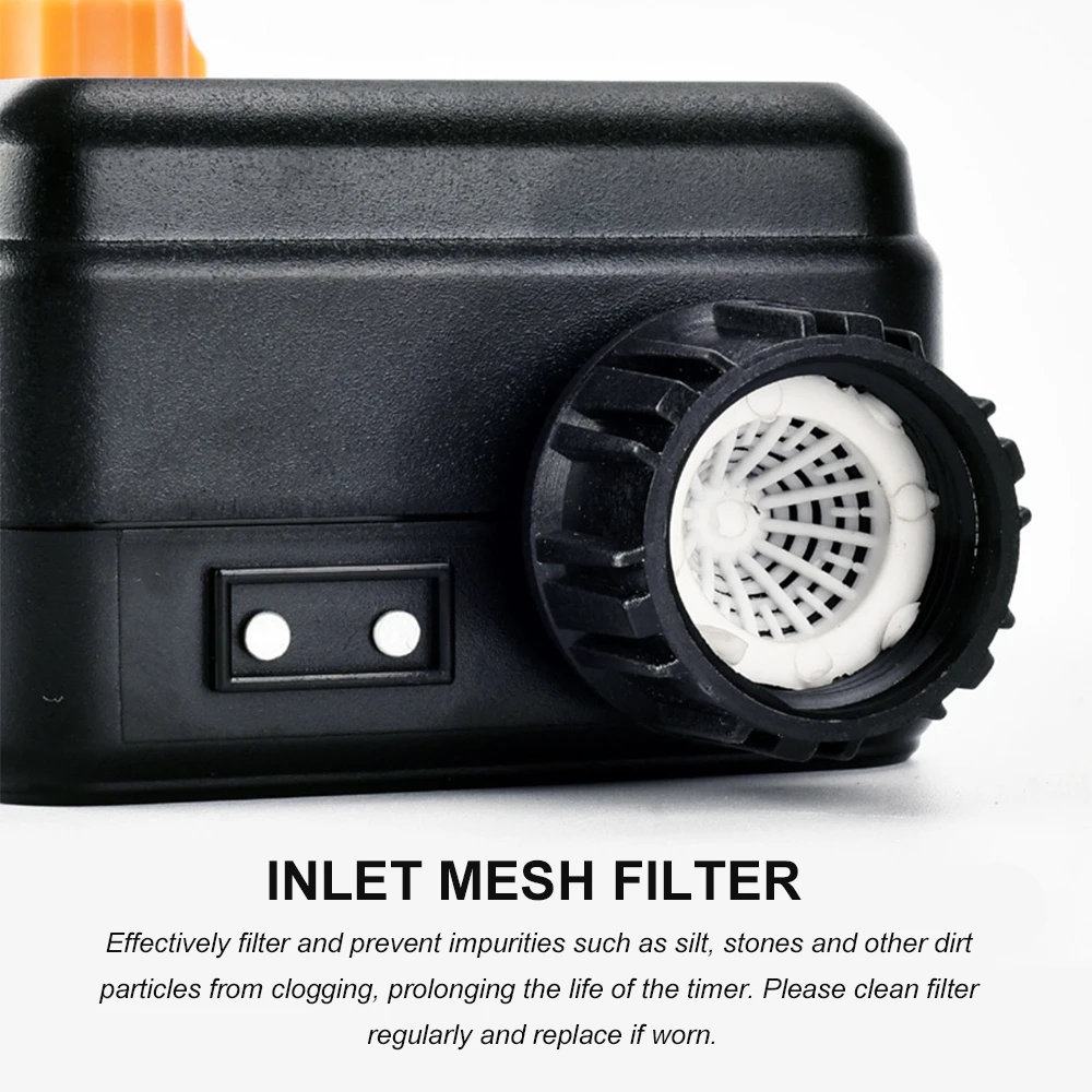 [Входной сетчатый фильтр] эффективно фильтрует и предотвращает засорение примесей, таких как ил, камни и другие частицы грязи, продлевая срок службы таймера. Пожалуйста, Регулярно очищайте фильтр и замените его при ношении.