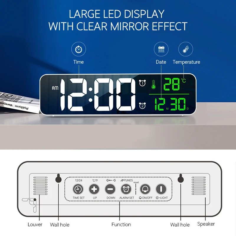 Характеристики продукта: 1. СВЕТОДИОДНЫЙ цифровой дисплей 2. Время, дата и температура отображаются на одном экране 3. Отображение температуры, конвертируемое между фаренгейтом и цельсием 4. Необходимо подключить к источнику питания, нет необходимости сбрасывать после переключения режима питания/сбоя питания, Но на экране не отображается 5,24 часов/12 часов преобразования 6,40 музыки будильника на выбор 7. Громкость будильника можно регулировать вручную 8. Светодиодсветодиодный пятиуровневая яркость можно регулировать 9. Две группы будильников управлясветодиодный светодиодами самостоятельно, а время будильника-2 минуты 10. Конструкция с двойным настенным отверстием, настенный монтаж также может быть столиком 11. Конструкция с низким энергопотреблением, необходимо подключить, рекомендуется использовать адаптер 5 в 1 А
