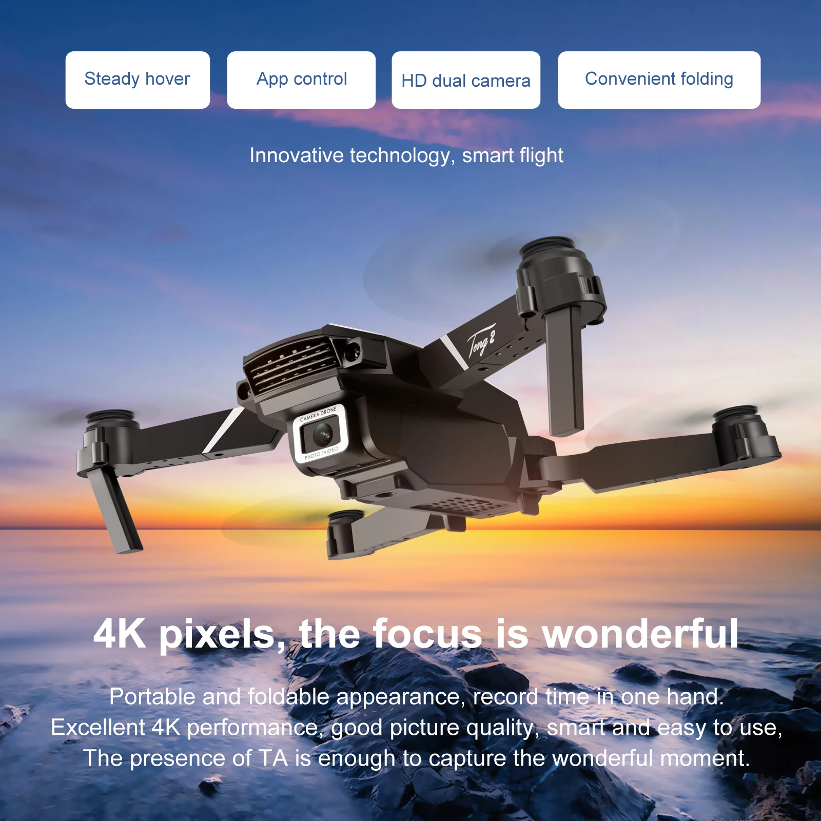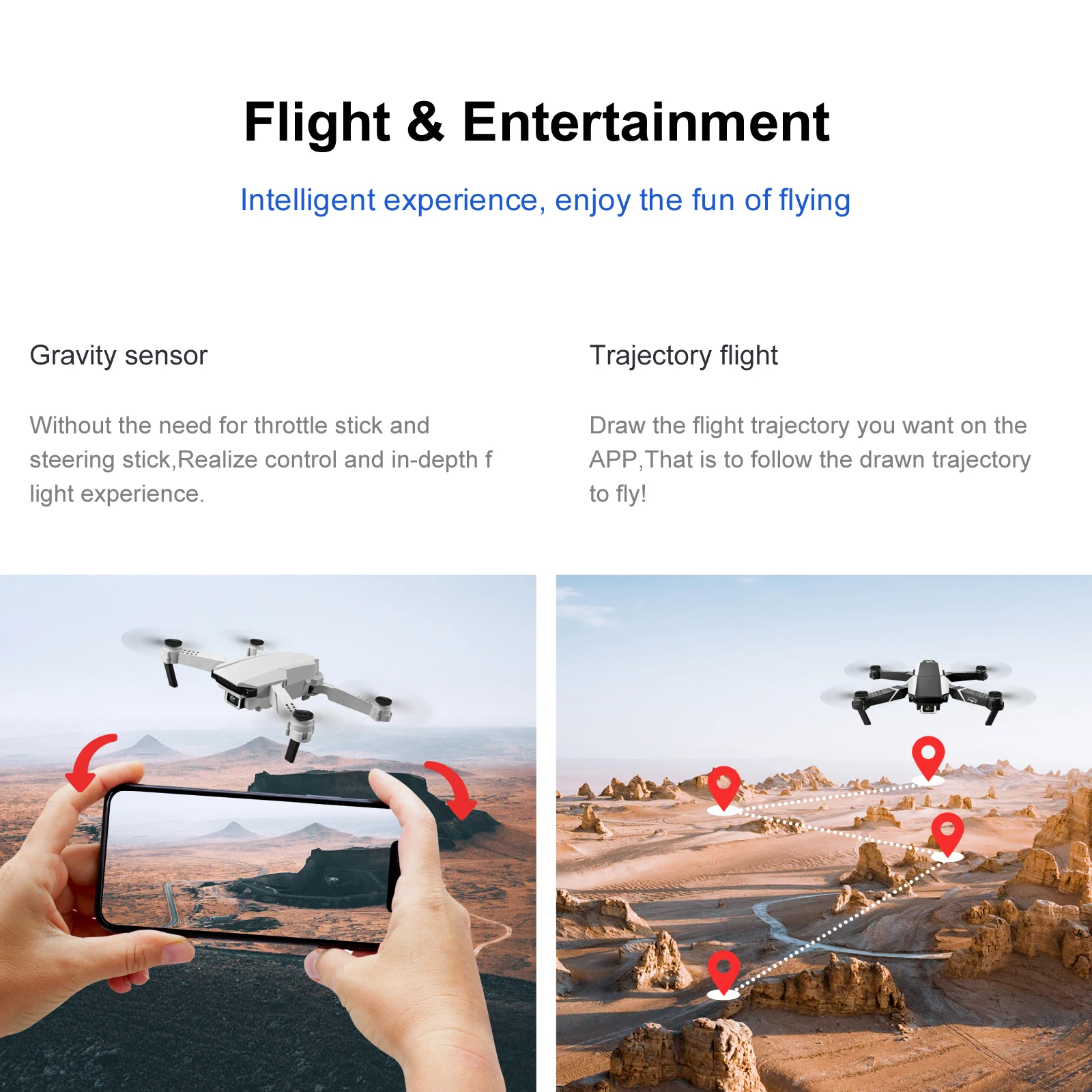 -Следуйте за мной в режиме. Куда бы вы ни отправились, Дрон будет следовать за вами и автоматически захватывать вас. Оставаясь на картинке в любое время, это облегчает достижение сложных целей, обеспечивая свободные руки и селфи-полет.