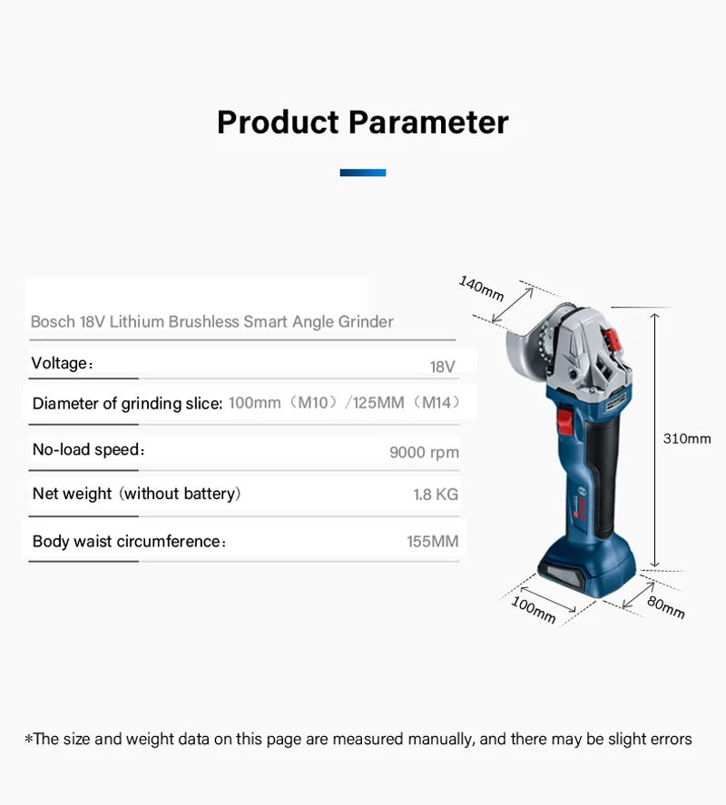 Bosch 18V литиевая бесщеточная умная угловая шлифовальная машина Напряжение: 18 вольт Диаметр шлифовального среза: 100 мм (M10) / 125 мм (M14) Скорость холостого хода: 9000 об/мин Вес нетто (без батареи): 1,8 кг Обхват талии: 155 мм