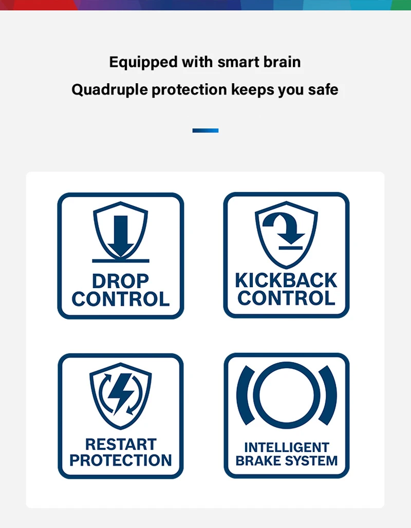Интеллектуальная Тормозная система: быстрая остановка после выключения кнопки питания Защита от перезапуска: когда выключатель инструмента включен, батарея не запустится случайно, когда батарея вставлена, и кнопку переключателя нужно нажать снова, чтобы нормально работать