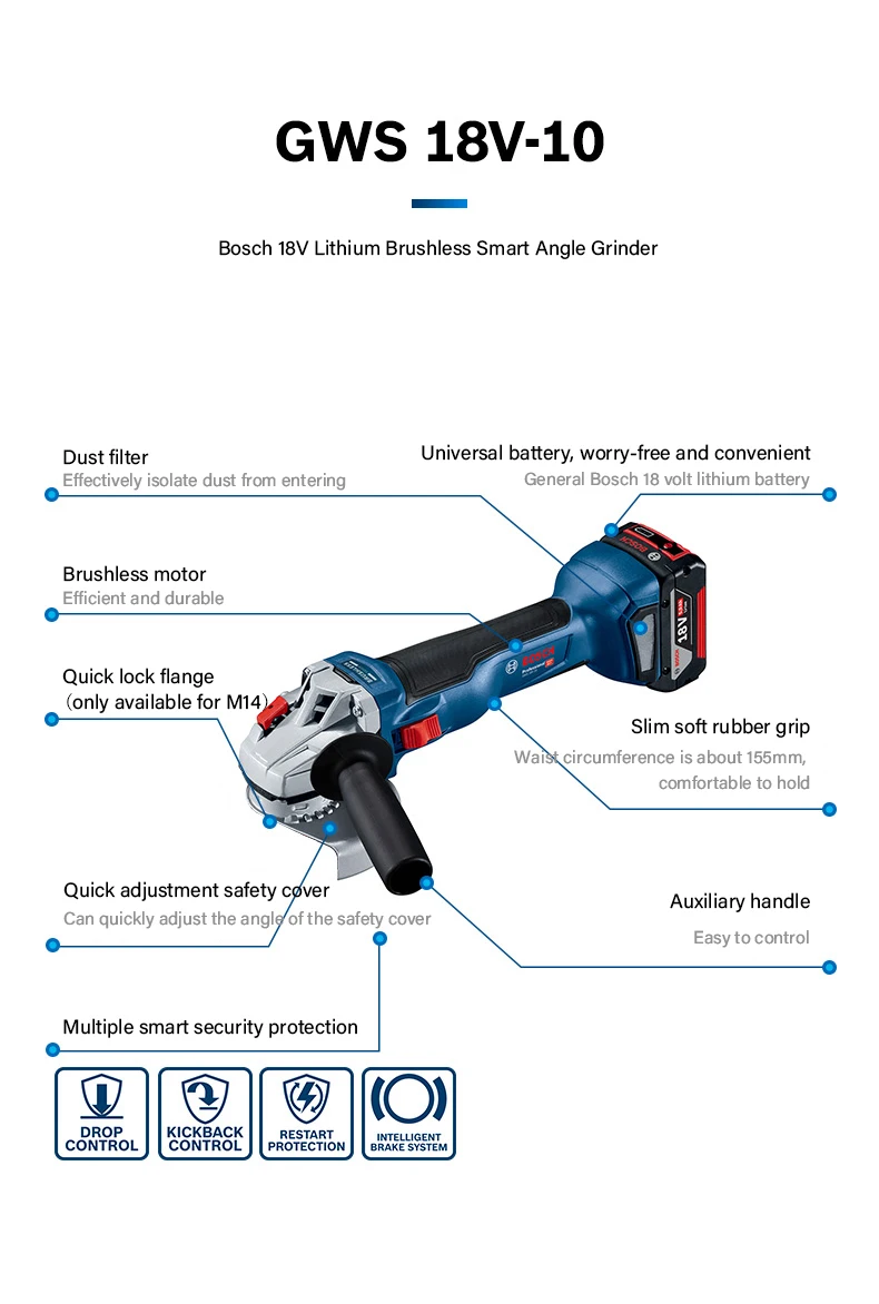 ① Пылезащитный фильтр эффективно изолирует пыль от попадания ② Эффективный и прочный бесщеточный двигатель ③ Фланец быстрого замка (доступен только для M14) ④ Быстрая регулировка защитной крышки. Угол защитной крышки можно быстро отрегулировать ⑤ Множественная Интеллектуальная защита безопасности ⑥ Аккумулятор универсальный, беззаботный и удобный. Универсальная литиевая батарея Bosch 18 в ③ Обхват талии тонкой мягкой резиновой ручки составляет около 155 мм, что удобно держать ① Вспомогательной ручкой легко управлять