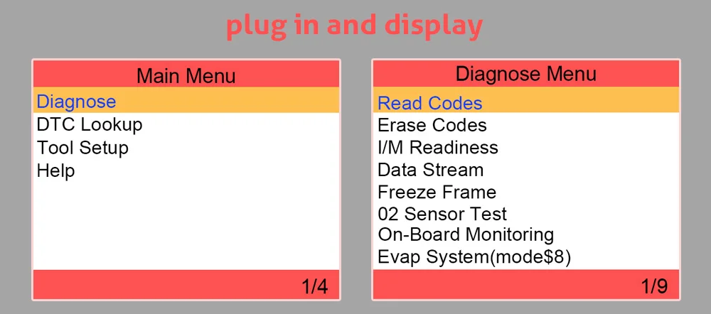 1. Чтение динамический, силу тока, постоянный коды неисправностей 2. Сброс кодов неисправностей 3. Система замораживания запрос данных 4. Кислородный датчик обнаружения 5. Наблюдение за конкретными система мониторинга транспортных средств 6. Считывание кода ошибки в режиме ожидания 7. Монитор системы или компоненты транспортного средства 8. Считайте информацию об автомобиле