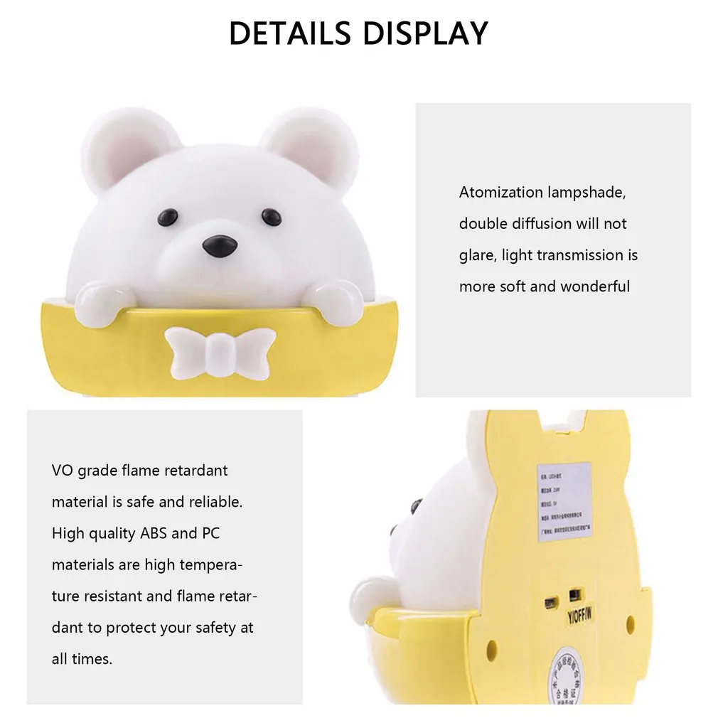 Особенности: 1. Функциональность: пульт дистанционного управления 3-5 м, 3 зубчатая передача, 3 режима светильник, затемнение, адсорбция магнита, простой и стильный, и прост в использовании. 2. Подходит для: Может использоваться в качестве настольной лампы, прикроватной лампы, подходит для детских комнат, коридоров и т. д. 3. Мягкий светильник: светильник мягкий в ночное время, освещает, не стимулируя ваши глаза, не влияя на сон одновременно обеспечивая хороший ночной светильник. 4. Дизайн: разработан с Медвежонок формы, этот светодиодный ночной Светильник проста, стильный, креативный и мило. 5. В качестве подарка: Эта творческая Медвежонок формы светодиодный Ночной светильник с перезаряжаемые пульт дистанционного управления может быть хорошим подарком для ваших друзей и близких. Описание: Эта творческая Медвежонок формы светодиодный Ночной светильник с Забавный внешний вид устройства, многофункциональный, и светильник-мягкие и не стимулирующее вам глаза. Характеристики: Размер: 108*96*58 мм Источник питания лампы: DC5V Вес брутто продукта: 190 г Светодиодный светильник Мощность: 2 Вт 0,2 Вт * 10 светодиодный s Аккумулятор: 1600 мАч литиевая батарея Время использования: 5 минут доступно в течение 5 месяцев Время зарядки: от 3 до 6 часов Посылка включает в себя: 1 * перезаряжаемый Ночной светильник с дистанционным управлением (зарядка через USB, с литиевой батареей 1600 мАч) 1 * клейкий железный лист 1 * зарядный кабель 1 * пульт дистанционного управления 1 * Руководство пользователя