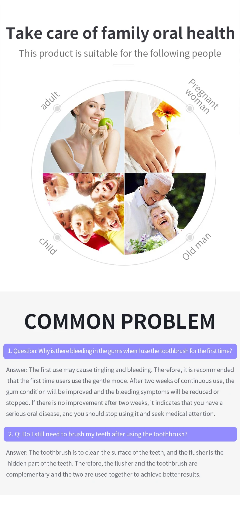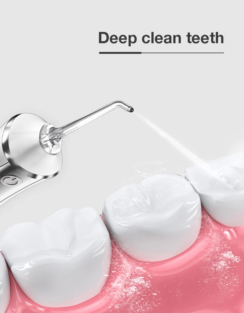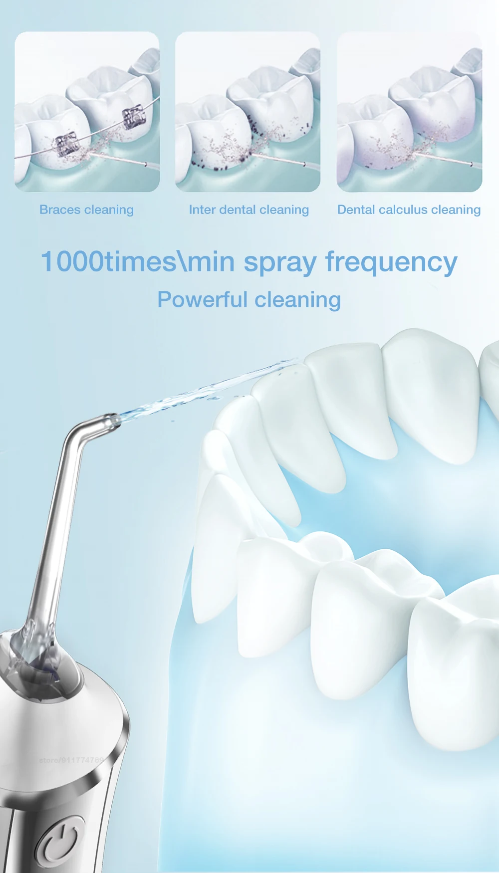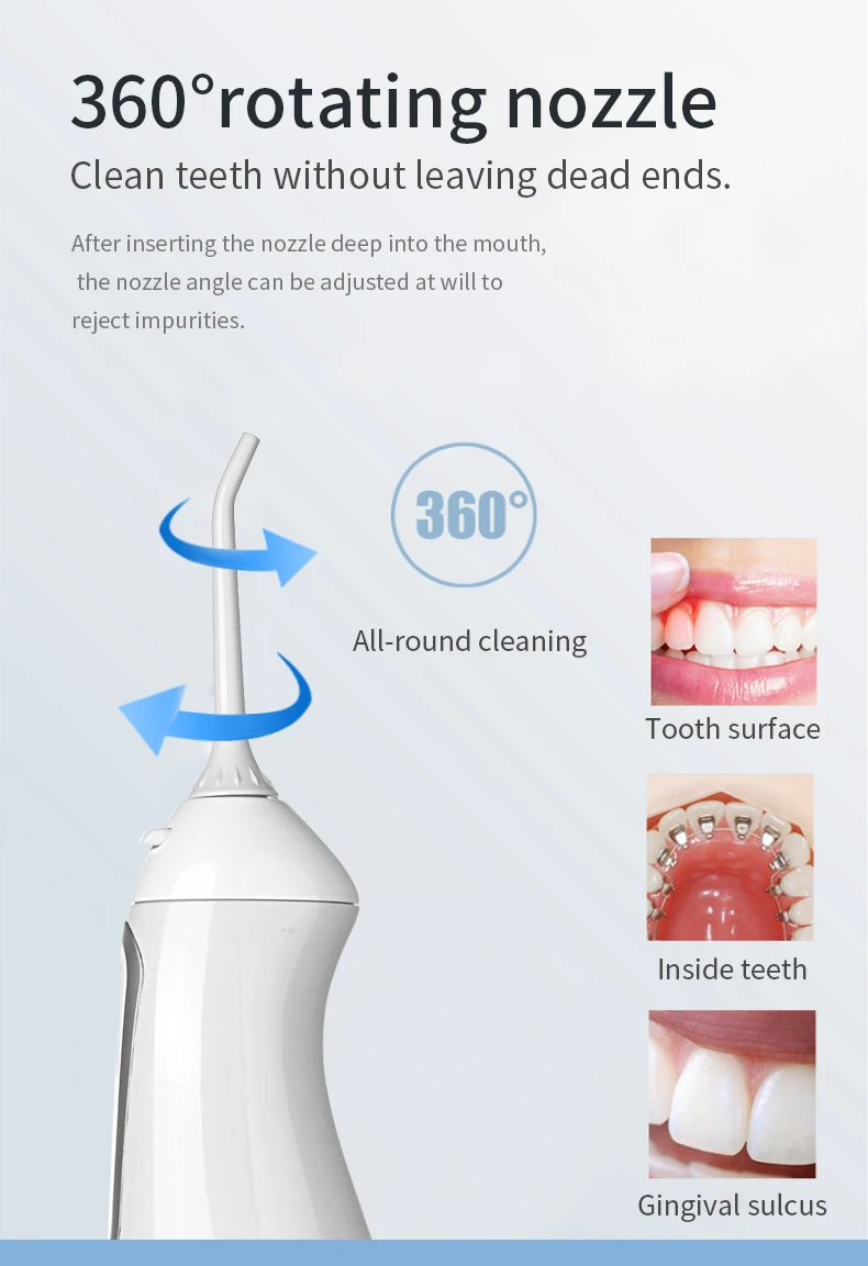 Вращающаяся на 360 ° длинная насадка, высокоинтенсивная импульсная водяная колонна очищает от 99.99% пятен зубов, которые не могут достигать традиционной чистки и плавления.