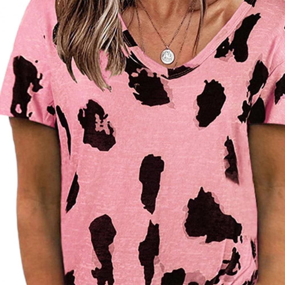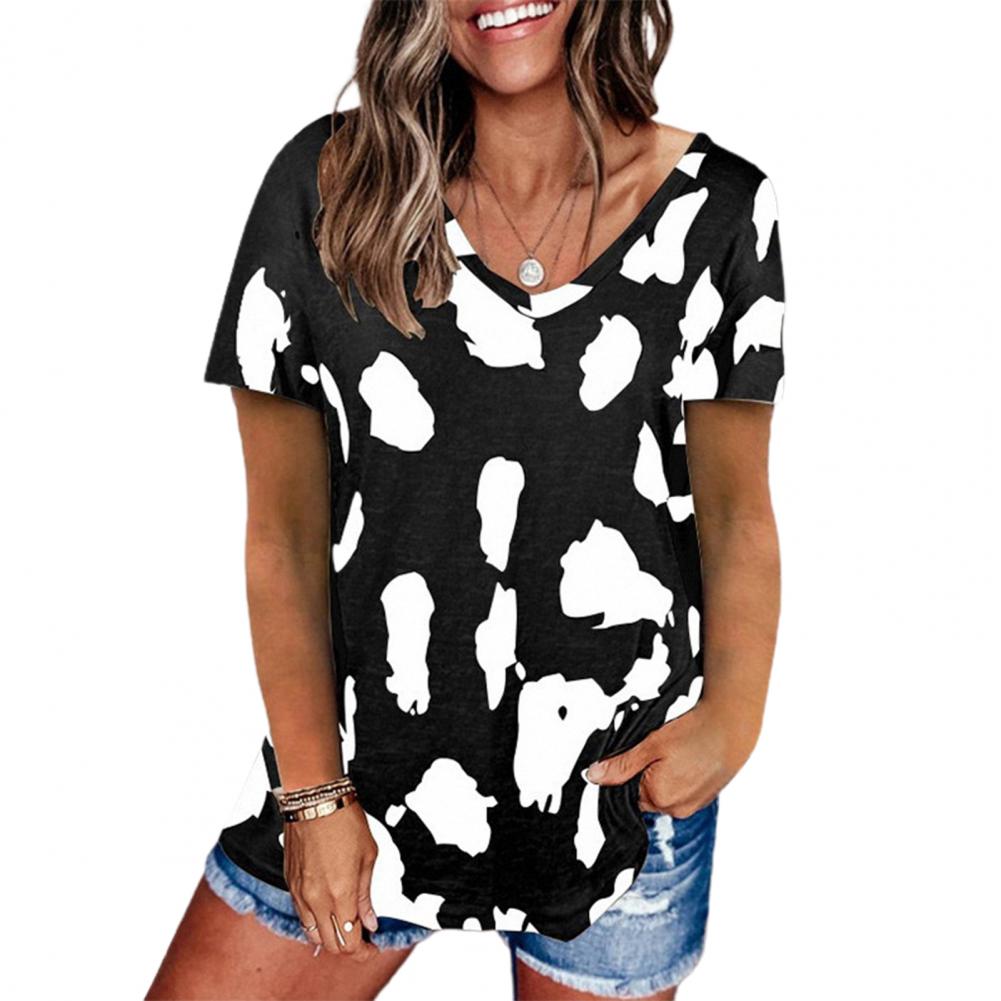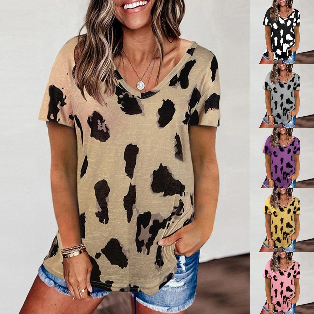 Это рубашка с короткими рукавами, с круглым воротником, свободным дизайном и леопардовым принтом, которая является декоративной и удобной в использовании.