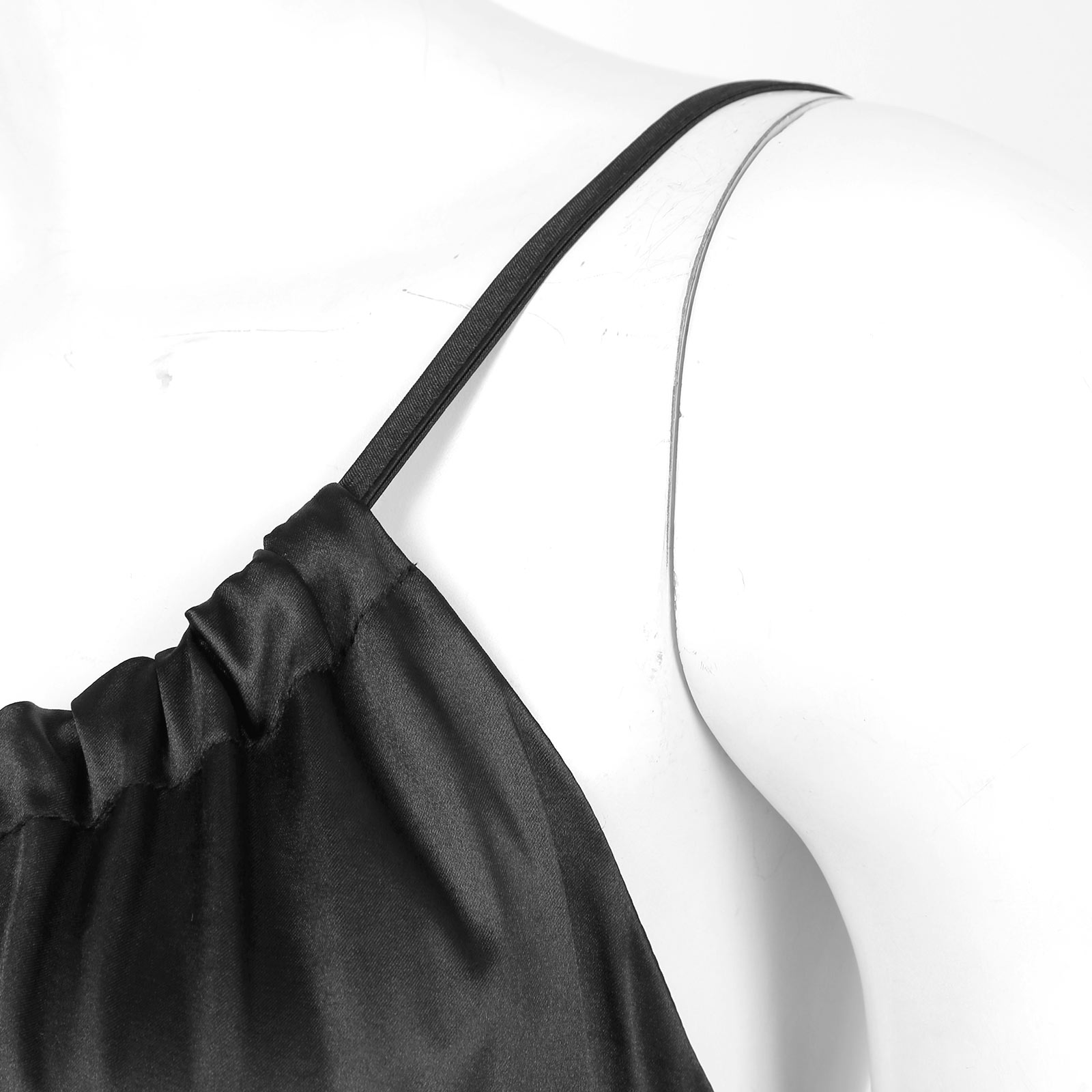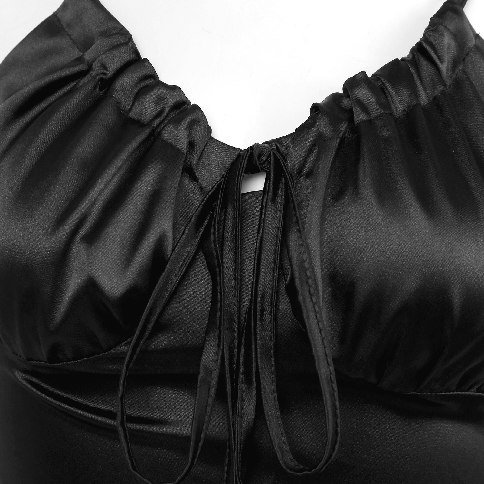 V-образный вырез со шнуровкой, застежка-молния сбоку, без рукавов и без спинки.