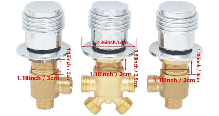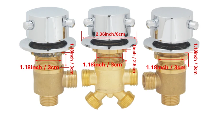 Клапан разделения воды: этот клапан используется для разделения воды. Этот клапан не может использоваться отдельно. На ванне клапан для разделения воды часто используется вместе с впускным клапаном. Этот клапан подходит расстояние от центра отверстия 1,22-1,38 дюймов/3-3,5 см.