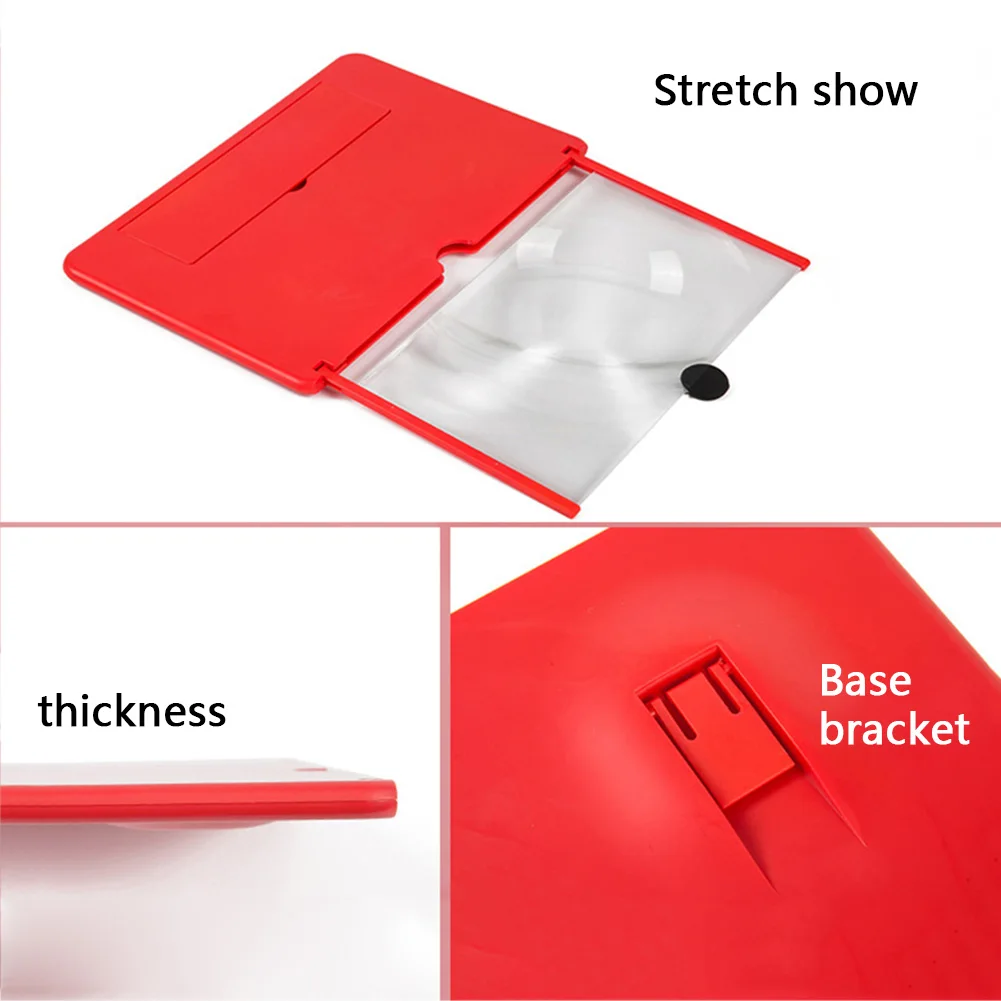 Mobile Phone Screen Amplifier Projector Portable Camping Travel Desktop 3D Video Movie Magnifying Glass Phone Support Bracket Stand Specification: Material: ABS plastic particle + Fresnel lens Color: Black, White, Red Size / Net weight / Gross weight: 10 inch: 190x130x10mm/7.48x5.12x0.39in, 270g, 270g 12 inch: 232x140x10mm/9.13x5.51x0.39in, 325g, 325g Magnification: 3 times Product functions: Magnification, eye protection, radiation protection, support Note: 1. Due to the different monitor and light effect, the actual color of the item might be slightly different from the color showed on the pictures. Thank you! 2. Please allow 1-3cm measuring deviation due to manual measurement.