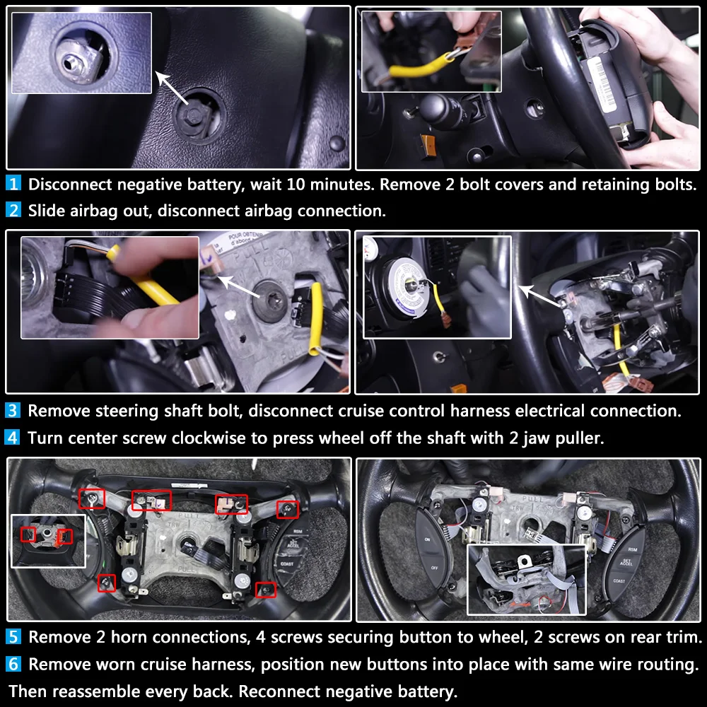 Отсоедините отрицательный аккумулятор, подождите 10 минут.Снимите 2 болта и удерживающие болты.Скользящая воздушная подушка, Отключение подключения подушки безопасности.Извлеките рулевой стержень болта, отключите круиз-контроль жгута электрического соединенияПоверните центр винта по часовой стрелке, чтобы отжать колесо от вала с 2 кулачковыми съемниками.Извлеките 2 роговых соединения, 4 винта для крепления кнопки к колесу, 2 винта для задней отделки.Удалите изношенный Круизный жгут, поместите новые кнопки на место с той же проводной маршрутизацией. Затем Соберите все детали обратно. Повторно Подключите отрицательный аккумулятор.Примечание: