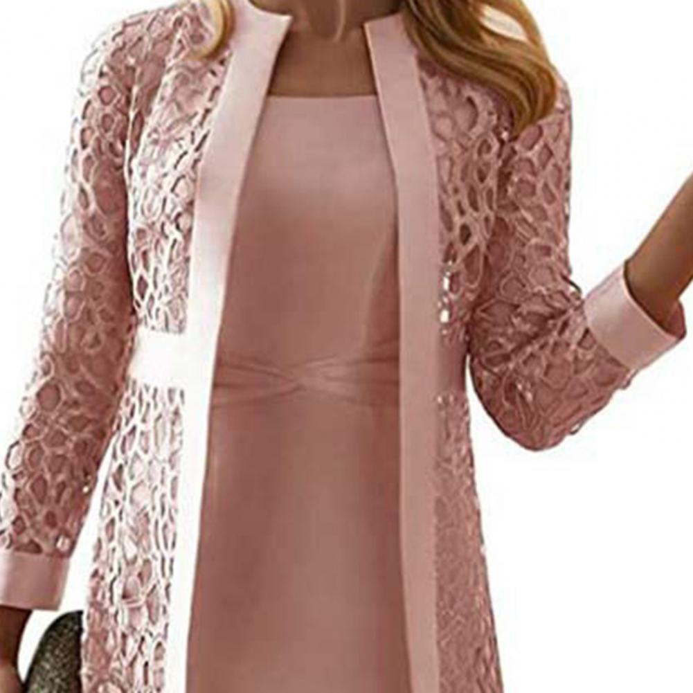 2021 Новый женский наряд, однотонный кружевной кардиган с длинным рукавом, Платье До Колена, пальто, комплект для офиса