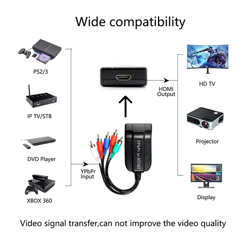 1 · Кнопка разрешения: разработан с кнопкой разрешения. Пользователи могут легко выбирать различные форматы вывода (4 варианта) в соответствии с вашим HDTV, обеспечивая лучшую совместимость. 2 · подключи и работай 3 · YPBPR Вход: 480i/p (60 Гц), 576i/p (50 Гц), 720p (50/60 Гц), 1080i/p (50/60 Гц). 4 · HDMI Выход: 720P (50/60 Гц), 1080P (50/60 Гц).