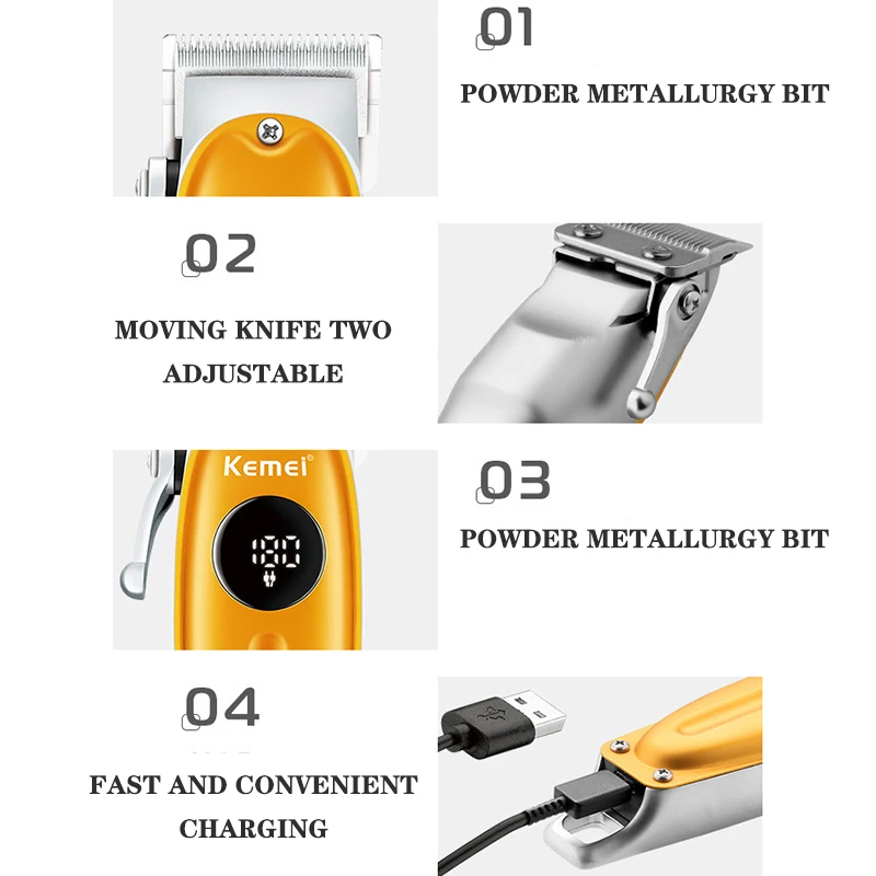 Напряжение: 5 В/5 Вт/50-60 Гц Размер: 19*4,5 см Sup Концевая расческа: 3 мм 6 мм 9 мм 12 мм Перезаряжаемый USB, зарядка 3 часа длится 180 мин Регулируемое лезвие ЖК-дисплей Не водонепроницаемый Низкий уровень шума