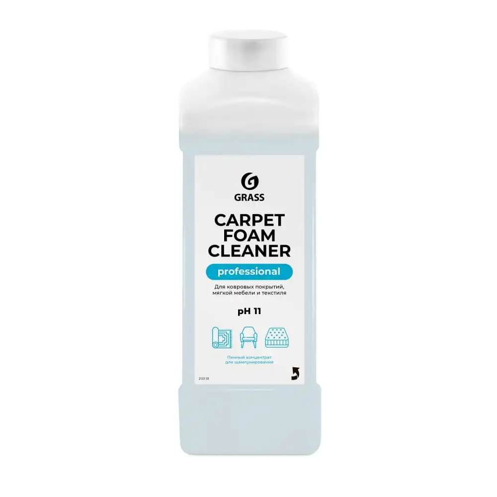 Carpet Foam Cleaner GRASS (ГраСС) 1 литр универсальное чистящее средство для ковров мебели ковролина. Универсальный пенный моющий состав для чистки ковровых покрытий и мягкой мебели от любых загрязнений.Средство для чистки ковров и мягкой мебели подходит для чистки ткани велюра из искусственной кожи, пластика и стекол. Жидкость для очистки в концентрированном виде применяется как пятновыводитель удаляет пятна от вина сока крови жира и другихзагрязнений, устраняет неприятный запах. Перед началом химчистки пропылесосить поверхность, удалить пятна растворителем или данным концентратом, не разбавляя с водой. Для общей чистки жидкое средство концентрат следует разбавить 1:6-1:20,50-150мл/л. Средство для чистки мягкой мебели нанести распылителем или ковровым экстрактором. Загрязнения при необходимости потереть щеткой. Остатки раствора вместе с загрязнениями собрать пылесосом или вручную. При нанесении с помощью экстрактора, промыть поверхность водой. Очистить домашний ковер стало проще.