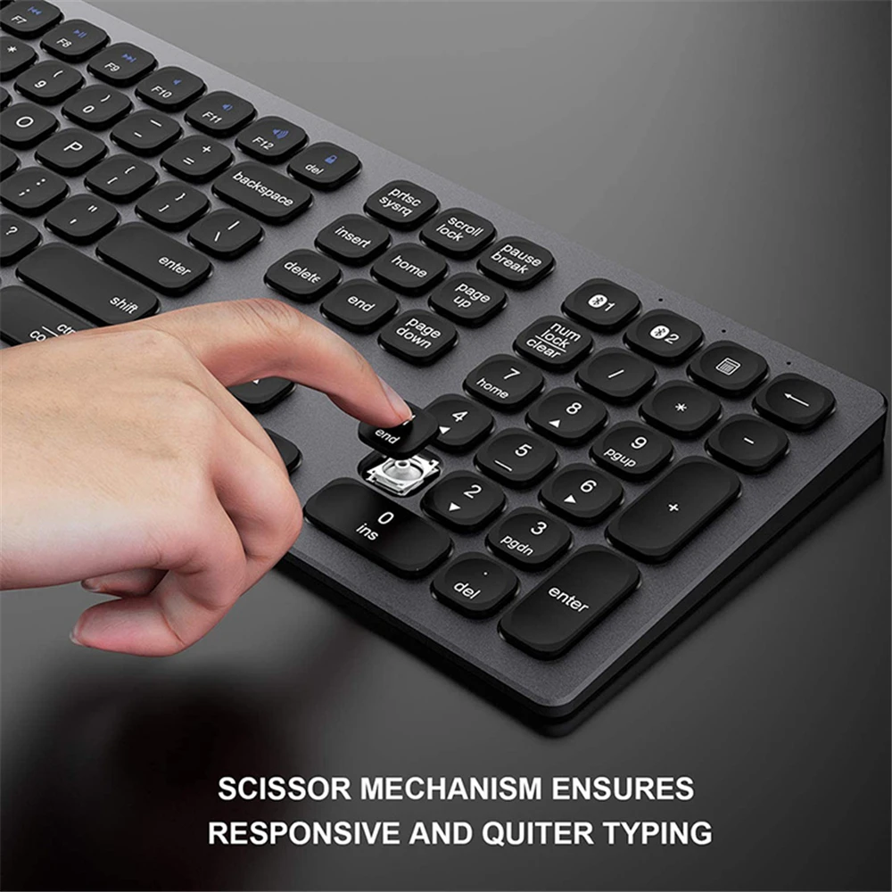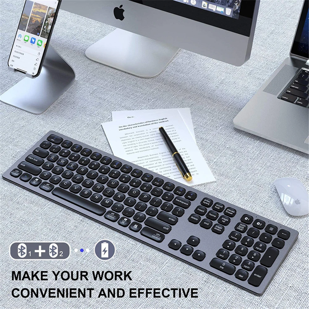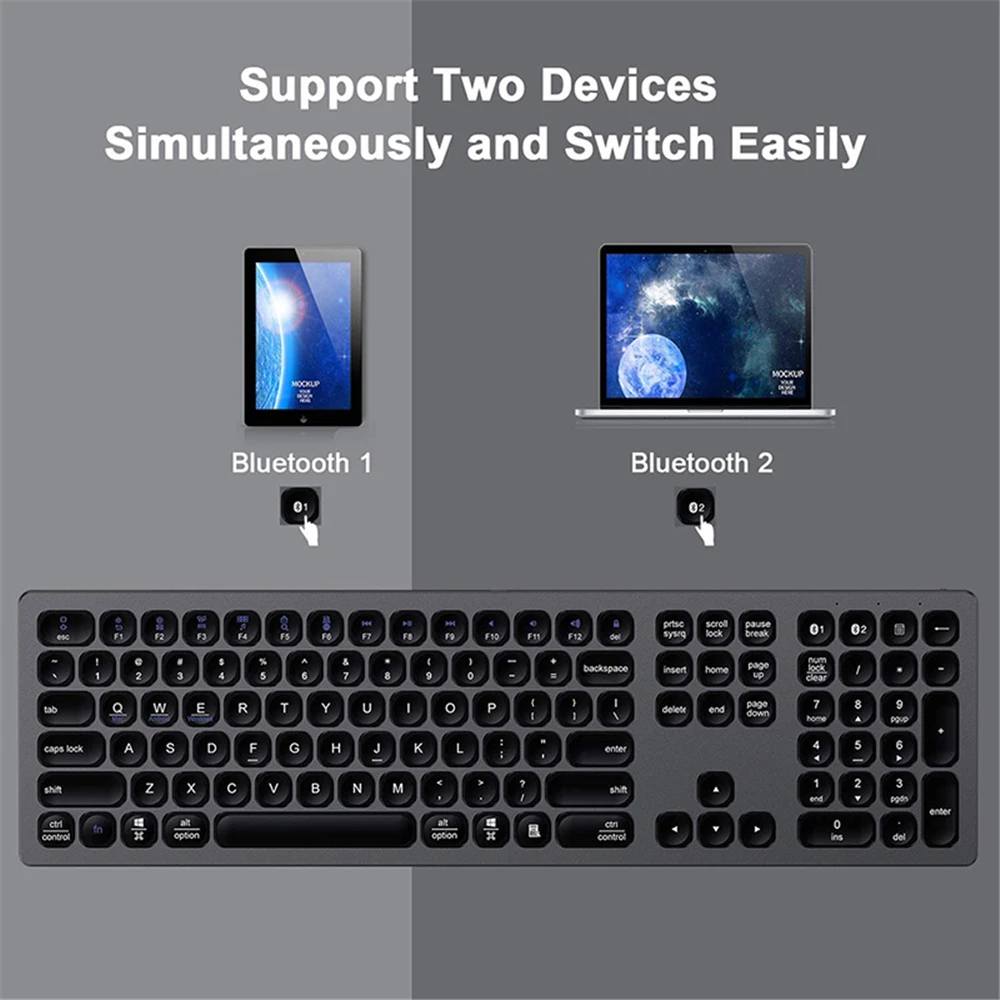 【Switch Devices easily】bluetooth-совместимая клавиатура поддерживает два устройства одновременно. Просто нажмите на клавиатуру Bluetooth-совместимый 1 или Bluetooth-совместимый 2 может легко переключаться между двумя устройствами, что позволит сэкономить ваши деньги и сделать вашу работу эффективной.