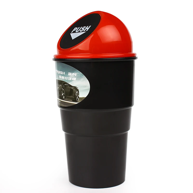 There is a spring cover, can place desktop; Also may be placed on a car, used to receive peel, wastepaper, etc. Throw the rubbish on the cover can be automatically bounce, convenient save trouble, closed. Product overall height of 21 cm The most widest point diameter for 10cm Bottom diameter is 6.8 cm Material: Plastic Color: Black/Red/Blue Weight: 104 gPackage Contents: