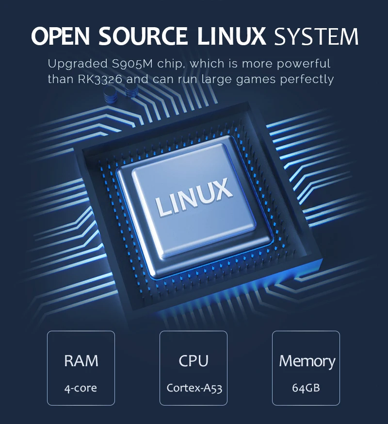 Мощный S905M, с 64-битной 4-х ядерный Процессор, 5 Mali-450 графическим процессором. Этот чип мощнее чем RK3326, с 64bit 4-х ядерный Процессор, 5 Mali-450 графического процессора, а также поддерживает 4K @ 60fps видео жесткий декодирования и HDR обработки.