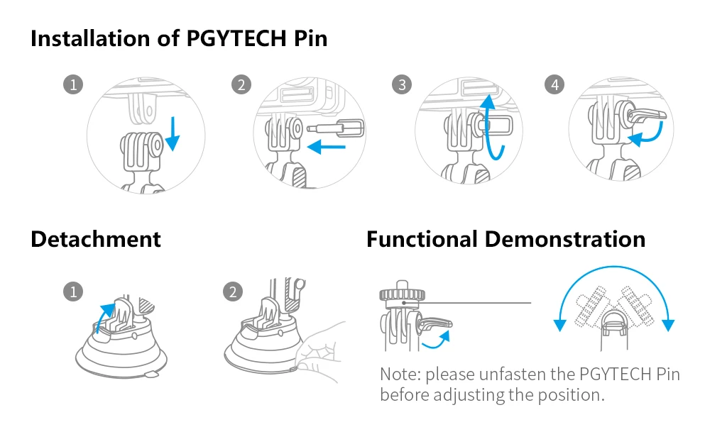 Please install suction cup on the smooth,flat surface as glass; Note: Please unfasten the PGYTECH Pin before adjusting the position;