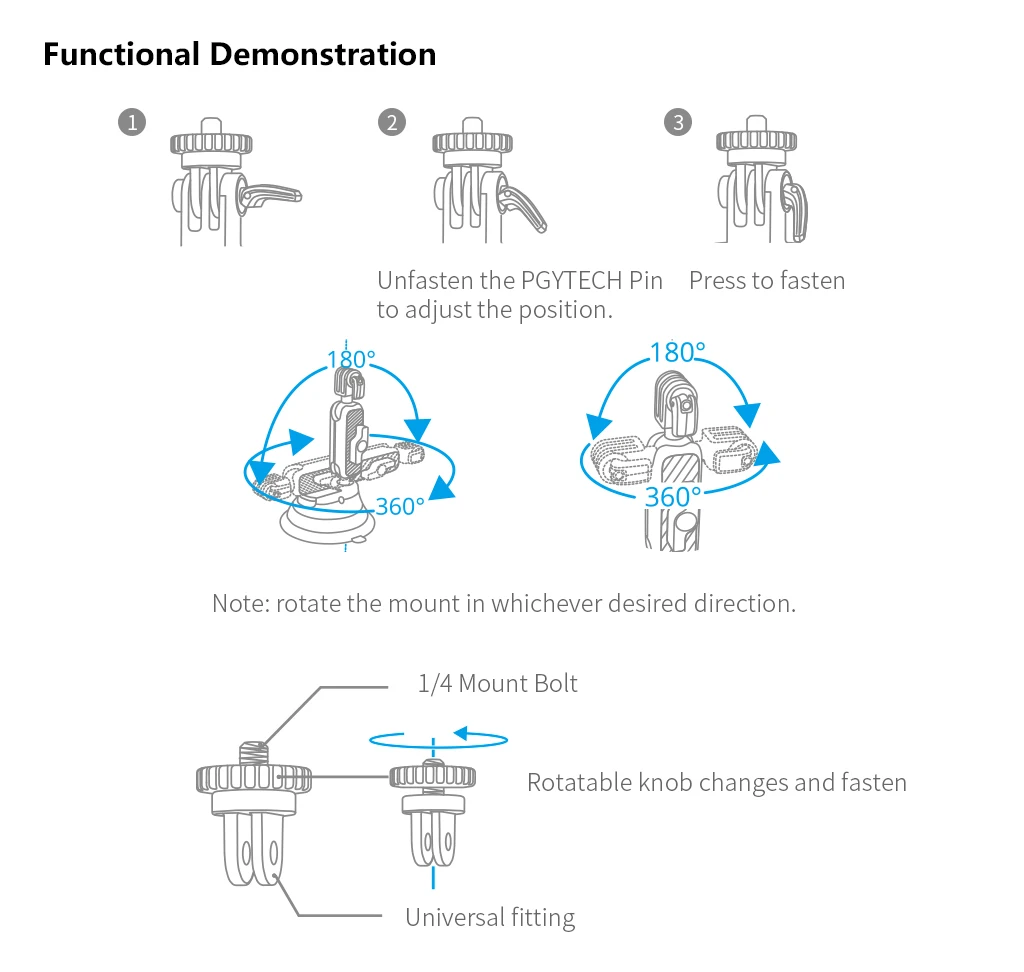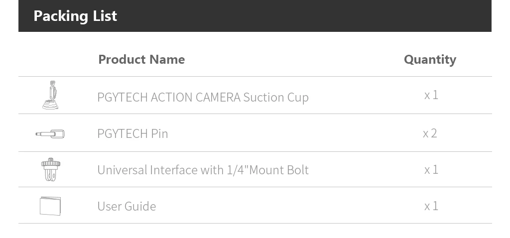ACTION CAMERA Suction Cup*1 PGYTECH Pin*2 Universal Interface with 1/4"Mount Bolt*1 User Guide*1
