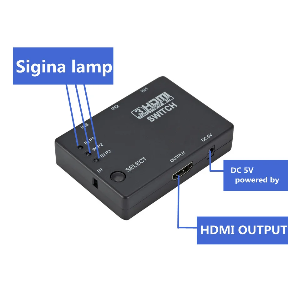 Посылка: 1 х HDMI распределитель с пультом дистанционного управления (без батареи) 1. Коммутатор HDMI 3x1 позволяет переключать 3 порта HDMI на один дисплей с помощью пульта дистанционного управления или кнопки включения 2. HDMI коммутатор может поддерживать видео форматы, включая 720p,1080i,1080p. Этот продукт также может быть помещен в конце длинного кабеля HDMi для регенерации сигнала hdmi. 3.100% новый и высокое качество. 4. Поддержка 2,5 Гбит/с скорость передачи данных для tmds часов до 250 МГц. 5.Full HD 1080P. Цвет: черный Материал: пластик 6. Поддержка HDMI 1.4a. 7. Поддержка формата 3D видео. 8. Поддержка 8/10/12 бит глубокий цвет. 9. Поддержка UXGA,WUXGA. 10. Поддержка стандартного кабеля AWG26 HDMI, вход до 10 м, выход до 10 м. 11. Поддержка одного дисплея высокой четкости для нескольких источников, таких как dvd-плеер, приемник A/V и телеприставка. 12. Поддержка HDTV проектора, ЖК-монитора, поддержка 1080P, 3D,XBOX, PS3, PS4, компьютера, Blu-Ray DVD и так далее