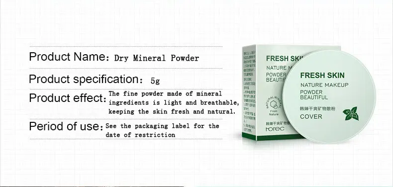 Название продукта: сухой минеральный порошок Спецификация продукта: 5 г эффект продукта: тонкий порошок, изготовленный из минеральных ингредиентов, светильник дышащий, сохраняя кожу свежей и естественной. Период использования: см. Этикетку упаковки для даты ограничения
