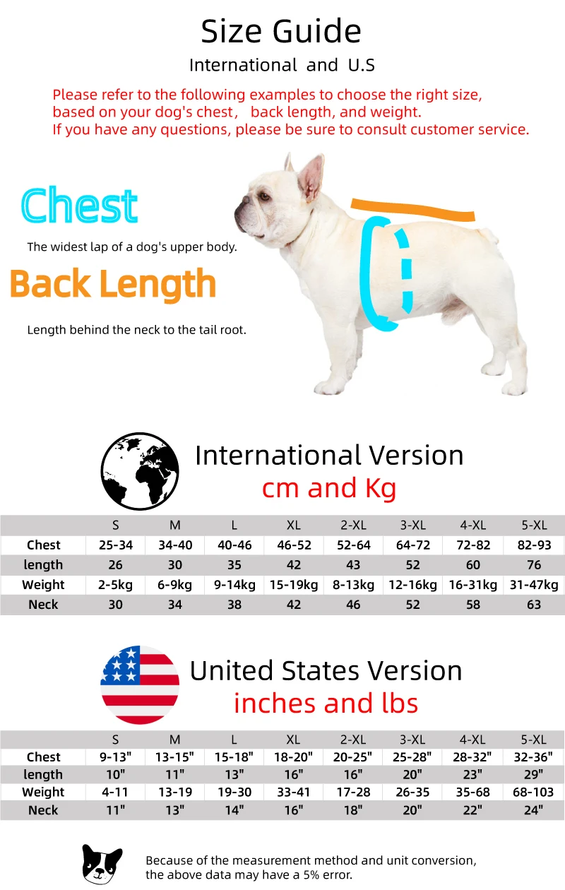 S : Chest 25-34CM Neck 30CM Length 26CM M : Chest 34-40CM Neck 34CM Length 30CM L : Chest 40-46CM Neck 38CM Length 35CM XL: Chest 46-52CM Neck 42CM Length 42CM 2XL: Chest 52-64CM Neck 46CM Length 43CM 3XL: Chest 64-72CM Neck 52CM Length 52CM 4XL: Chest 72-82CM Neck 58CM Length 60CM 5XL: Chest 82-93CM Neck 63CM Length 76CM