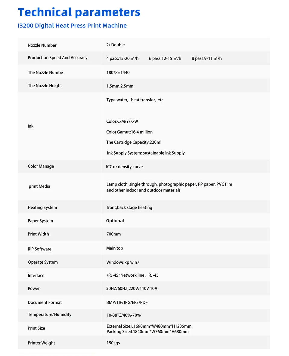 Модель: l3200 цифровой термопресс печатная машина Печатающая головка: 2 шт. Epson 4720/ EPson I3200-A1 Скорость и точность: 4 прохода: 15-20 м/h6 прохода: 12-15 м/h8 pass9-11 м/ч Ширина печати: 850 мм Управление цветом: кривая lCC или плотности Операционная система: WindowsXPWin 7 Формат документа: BMP/TIF/JPG/EPS/PDF Размер печати: 1940*810*1450 мм Вес принтера: 130 кг