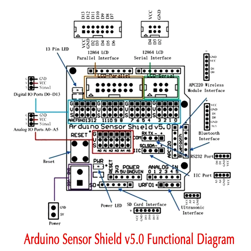 Отказ от ответственности:НовейшийПлата расширения датчика V5.0Все еще использует дизайн стека, материнская плата не толькоUnoВсе цифровые и аналоговые интерфейсы для расширения формы заказа рулевой линии, а также специальный интерфейс IIC,Интерфейс серводвигателя,Модуль BluetoothИнтерфейс связи, модуль интерфейса sd-карты в общении,APC220 RF модульИнтерфейс связи,Ультразвуковые датчикиИнтерфейс,12864 ЖК-дисплейПоследовательные и параллельные интерфейсы, независимое расширение более удобное в использовании. Для начинающих, а не для громоздкого и сложного подключения к цепи и головной боли, упростит эту плату расширения датчика цепи в истинном плане, может легко использоваться для подключения датчика, датчик требует только общего кабеля датчика 3P (независимо от цифрового кабеля и аналогового кабеля), После завершения подключения к цепи напишите соответствующую программуКонтроллерПрочтите данные датчика или получите данные о возврате беспроводного модуля через арифметическую обработку и в конечном итоге легко завершить свои собственные интерактивные работы.