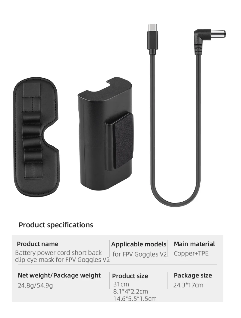 Характеристика: 1. Интерфейс изготовлен из оловянного материала, который эффективно предотвращает окисление и ржавчину, 2. Встроенный медный сердечник, источник питания более стабильный, 3. Высококачественные материалы, износостойкие, Антивозрастные и прочные. Описание: Материал: Медь + ТПЭ, применимые модели: для FPV очков V2, Цвет: Черный Вес нетто: 29,7 г (L), 10,5 г (S), 24,9 г (2 1 предмет), 24,8 г (Комплект из 3 предметов 1 предмет), посылка Вес: 32,2 г (L), 13g (S), 33,7 г (2 1 предмет), 54,9 г (Комплект из 3 предметов), размер изделия: 130 см (L), 31 см (S), 8,1*4*2,2 см (задний зажим), 14,6*5,5*1,5 см (маска для глаз), посылка Размер: 15*10 см, 18,5*13 см (комплект из 2 предметов), 24,3*17 см (Комплект из 3 предметов), Упаковочный лист: 1 шт. кабель питания. Примечание: 1. Не включает очки FPV V2 и батарею,