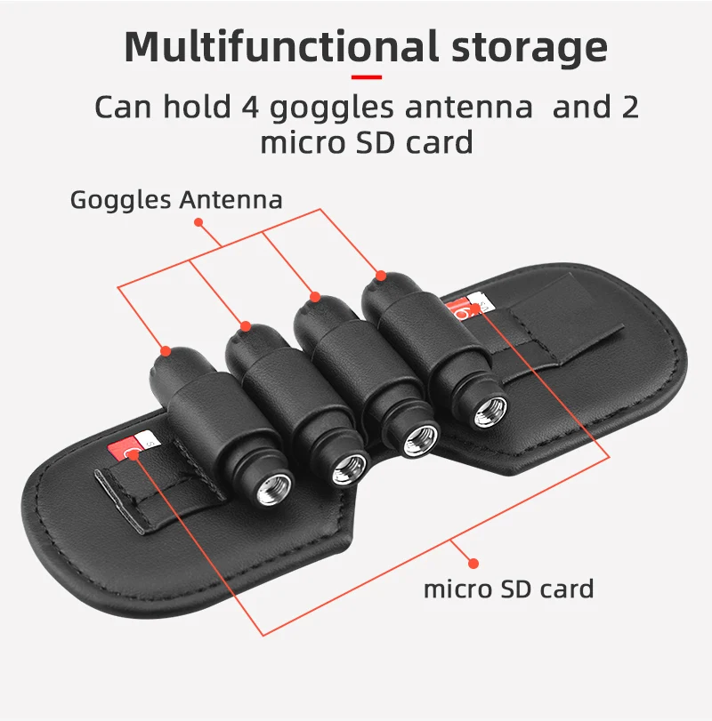 1. Специально для полетных очков FPV V2, пылезащитный, затеняющий и удобный для переноски, 2. Фланелевый Материал задней части защищает объектив от царапин, 3. С четырьмя антеннами для полетов и двумя слотами для карт Micro SD, 4. Легко устанавливается и разбирается.