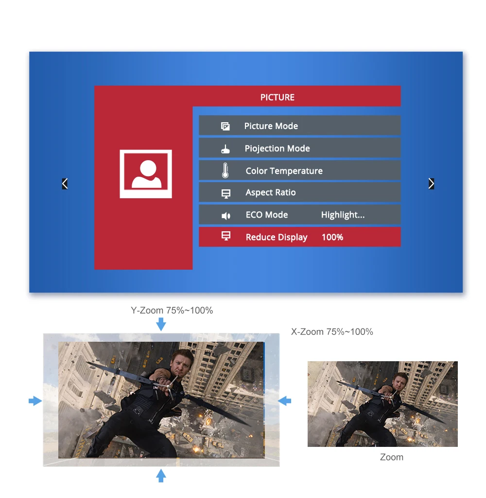 (Подключение к компьютеру через кабель HDMI или кабель VGA, даже ваш проектор установлен на фиксированном расстоянии, вы также можете использовать зум дисплея для регулировки размера проекции (режим USB поддерживает увеличение дисплея при воспроизведении видео или изображений.)