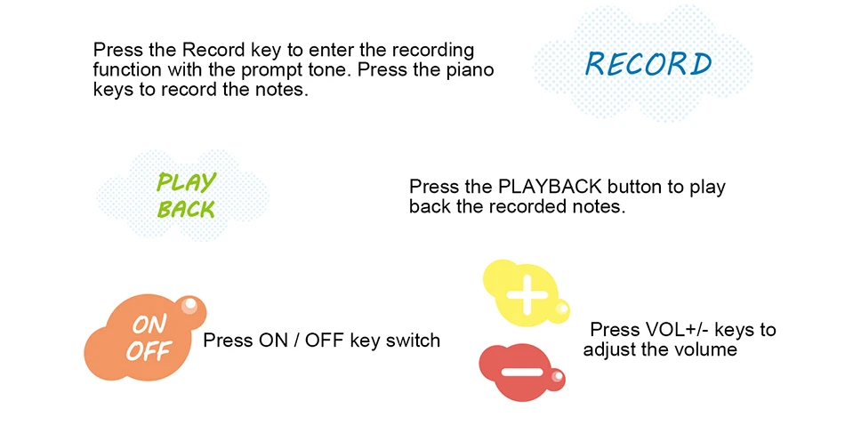Function: One Key One Note/Recored/Play Back/Melody Mode/8 Instruments Changing