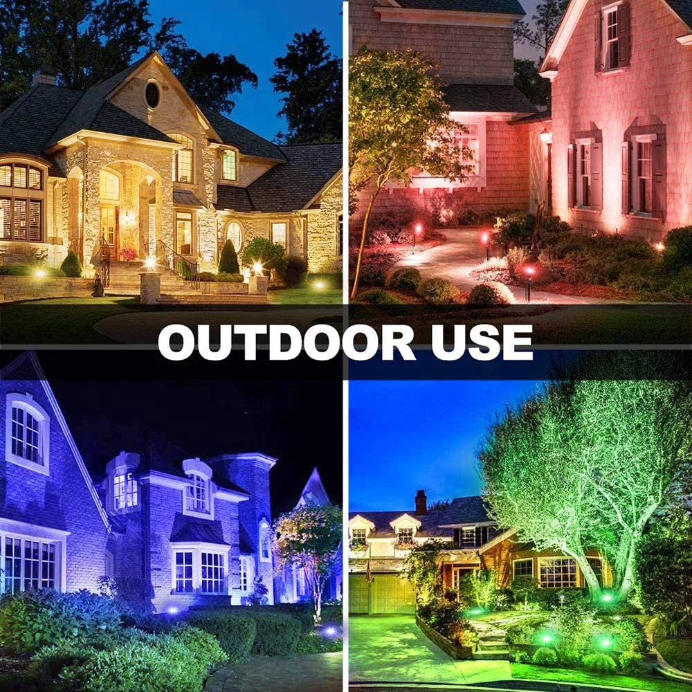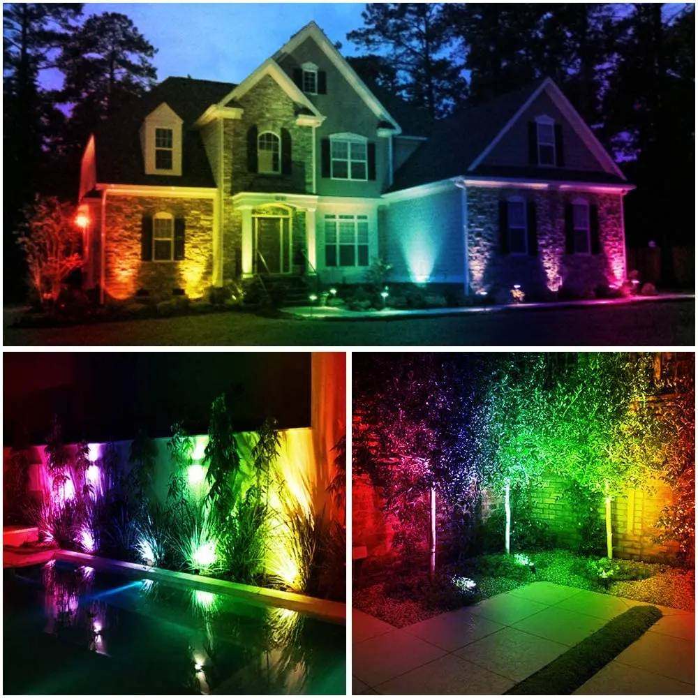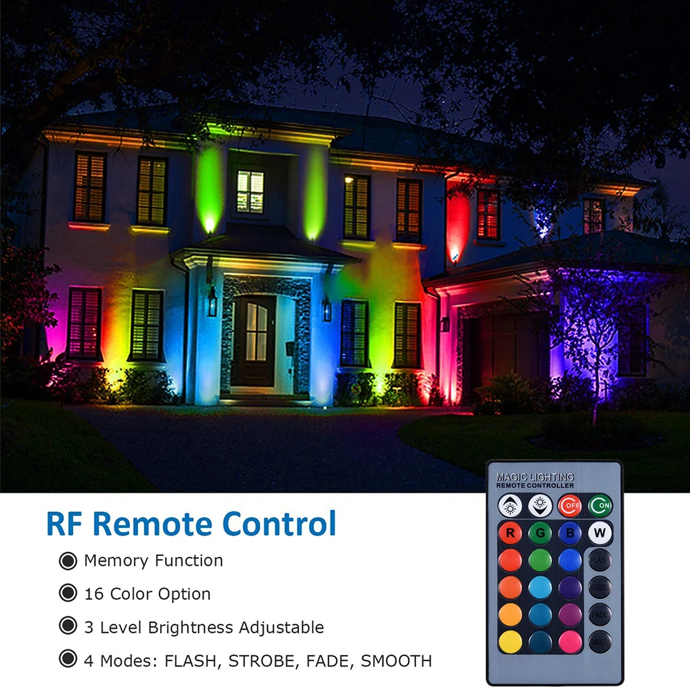 RGB светодиодный ландшафтный свет с 16 цветными режимами, управляемый радиочастотным пультом дистанционного управления, его сигнал не будет зависеть от препятствий. 4. Мигающая вспышка/Стробоскоп/выцветание/плавность режимов, цвет и яркость регулируются.