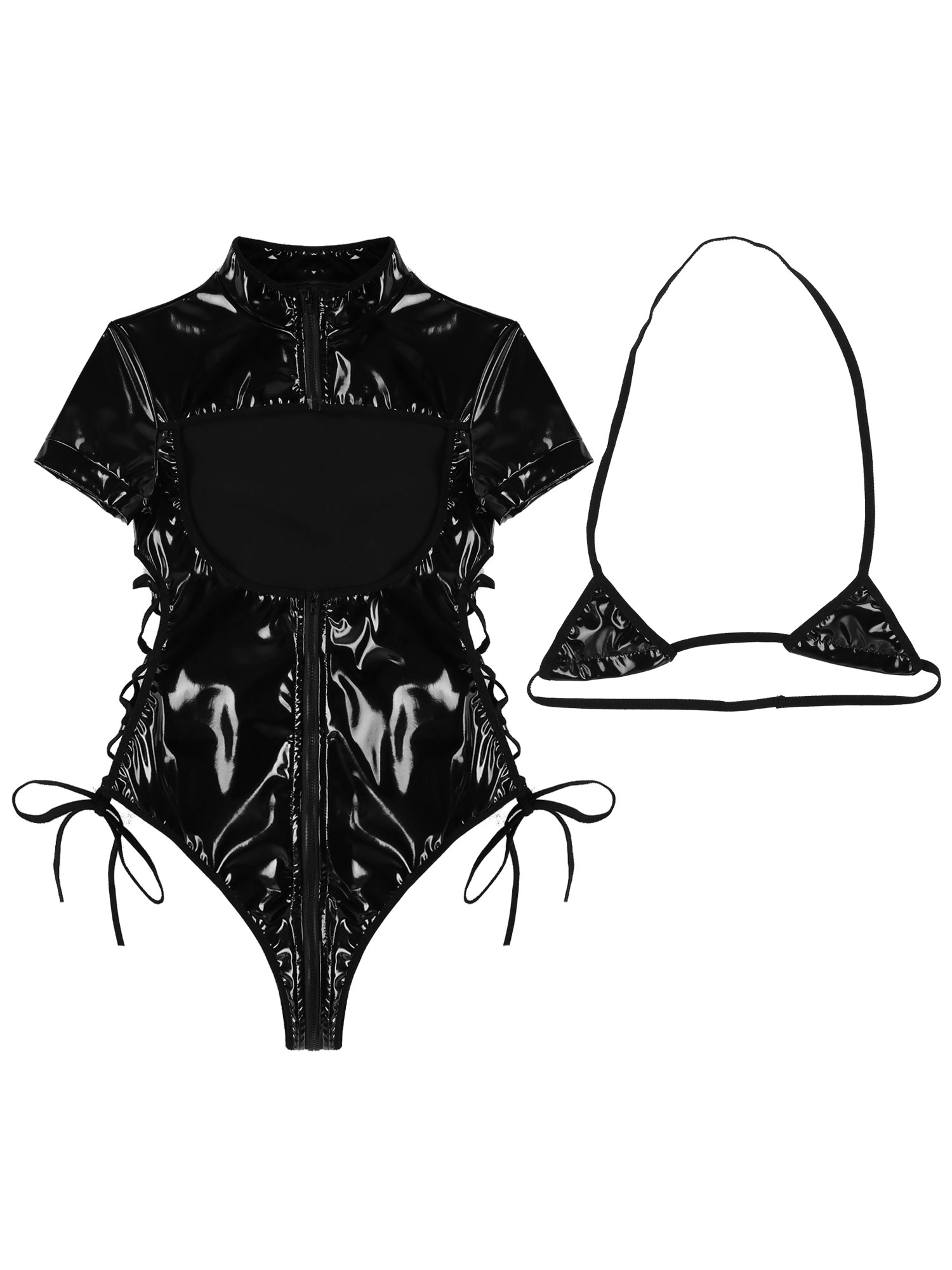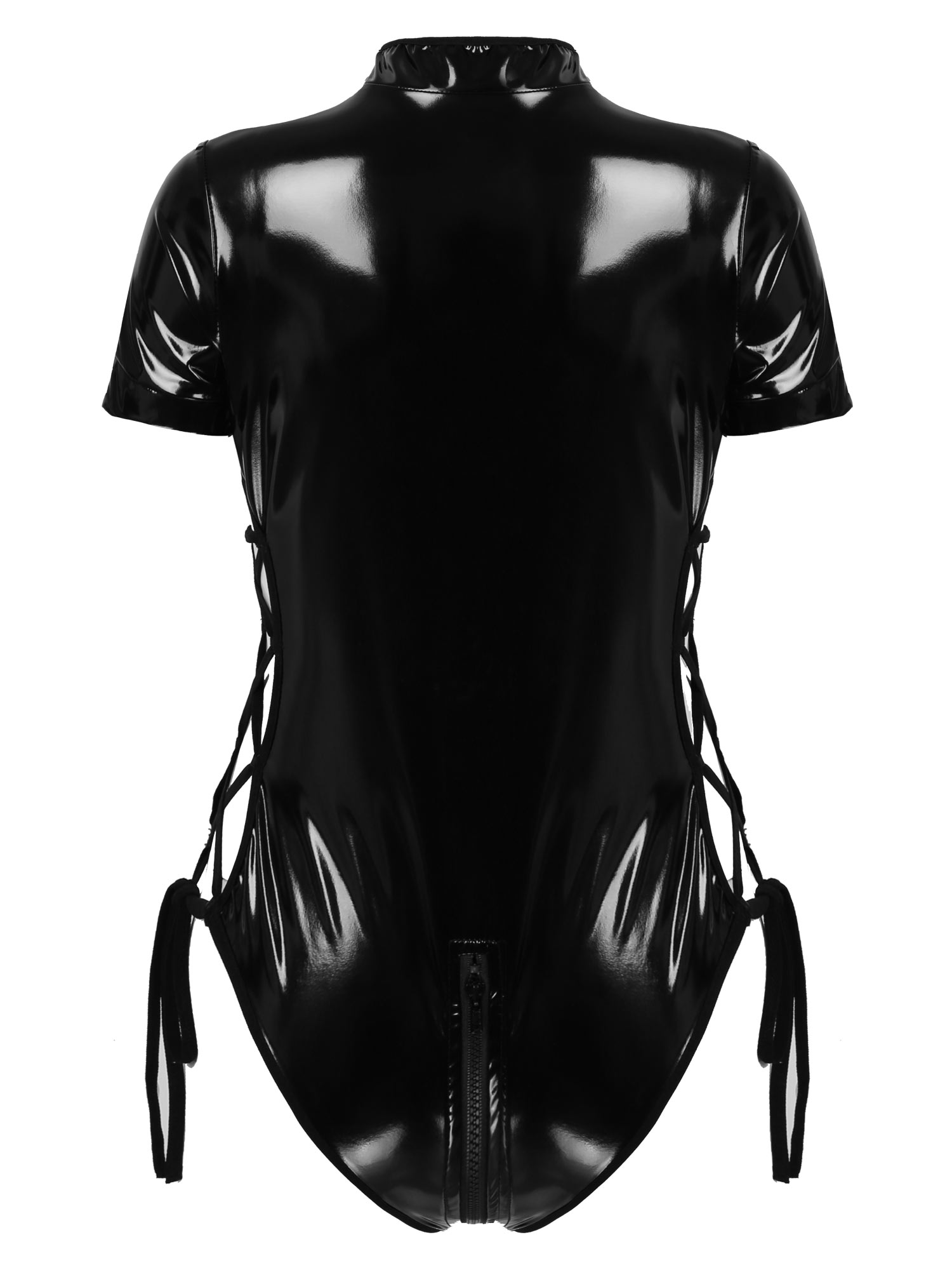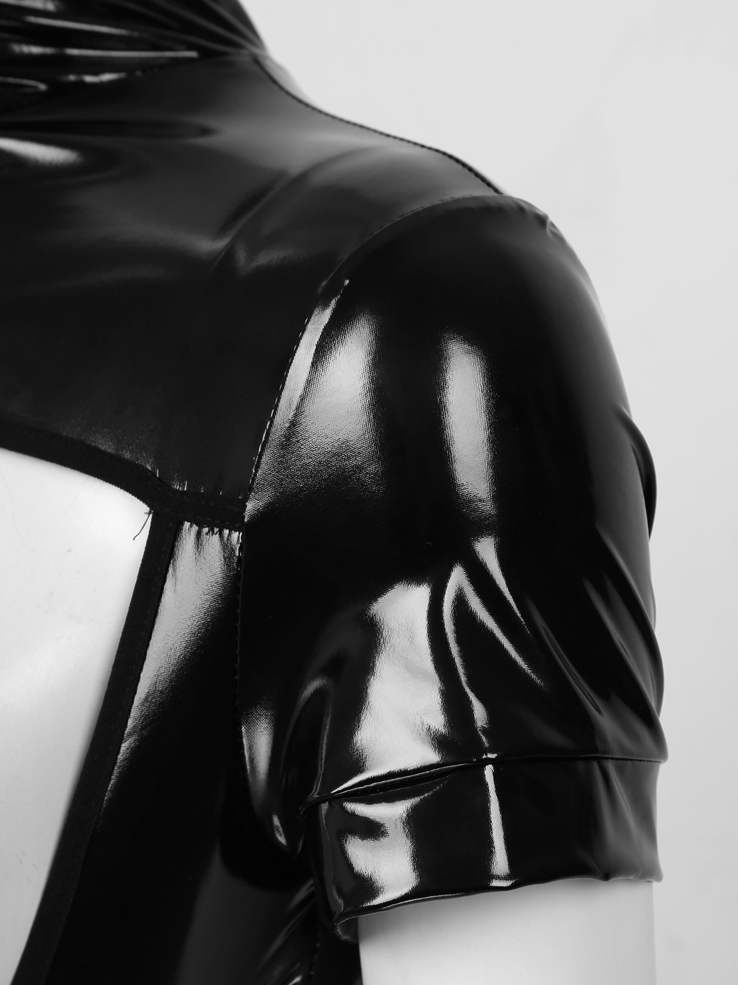 Женское боди из лакированной кожи с вырезами и воротником-стойкой, короткий рукав по бокам, Облегающий комбинезон с застежкой-молнией и бюстгальтером.
