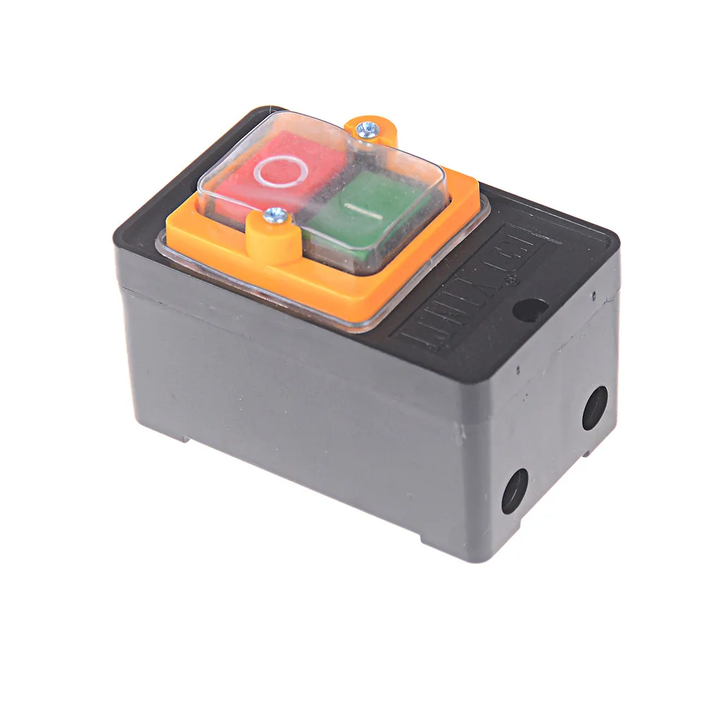 Кнопка включения-самоблокировка, кнопка выключения-автоматический сброс.