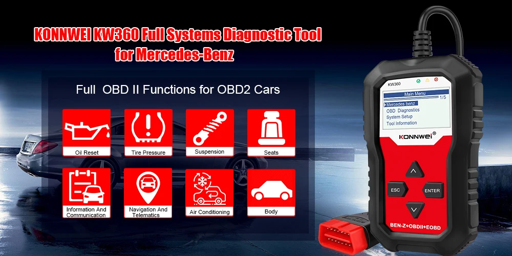KONNWEI KW360-это полный диагностический сканер obd2 для автомобилей серии Mercedes Benz, который позволяет проверять все электрические проблемы транспортных средств, а также удалять их одним щелчком. KW360 способен считывать коды неисправностей двигателя, abs (антиблокировочная тормозная система), подушки безопасности, коробки передач, EPB..., до 100 электронных систем, которые могут быть автоматически отсканированы KONNWEI KW360. Кроме того, он оснащен всеми функциями OBDII, что позволяет диагностировать и сбросить систему, когда включается контрольный светильник двигателя. KONNWEI KW360 также включает 4 Специальные функции, которые вы можете выполнить как профессиональная техника, как, например, масляные краски, Услуги светильник сброс, Батарея одинаковая, электронный стояночный тормоз Заменить & положения дроссельной заслонки диагностики.