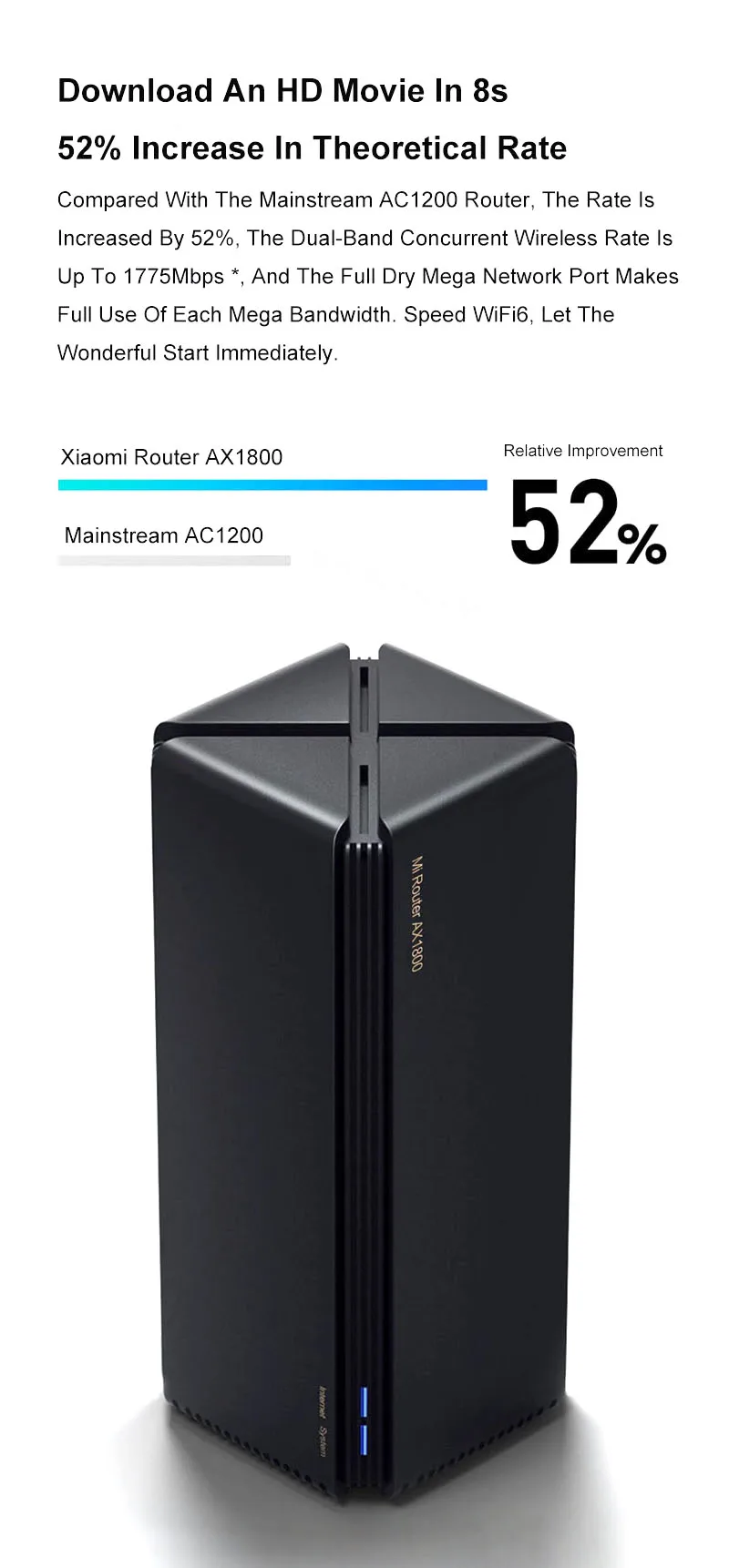 По сравнению с другими роутерами скорость увеличена на 52%, параллельная Двухдиапазонная скорость беспроводной связи составляет до 1775 Мбит/с ", И полностью сухой сетевой порт mega полностью использует каждую мегаполосу пропускания.