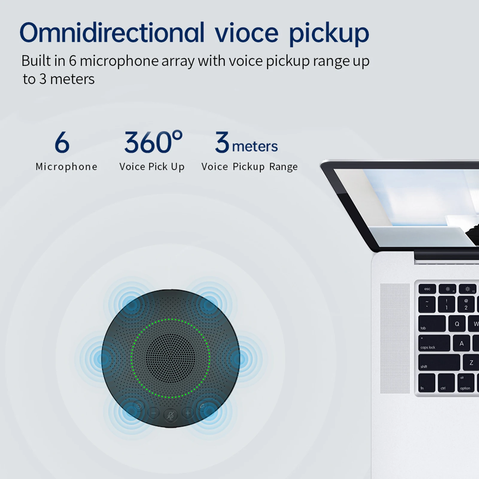 360 ° пикап:Оснащен 6 всенаправленными микрофонами, звуком 360 ° и чистым и естественным звуком, который может быть получен в диапазоне около 30 квадратных метров, с радиусом захвата 3 метра.