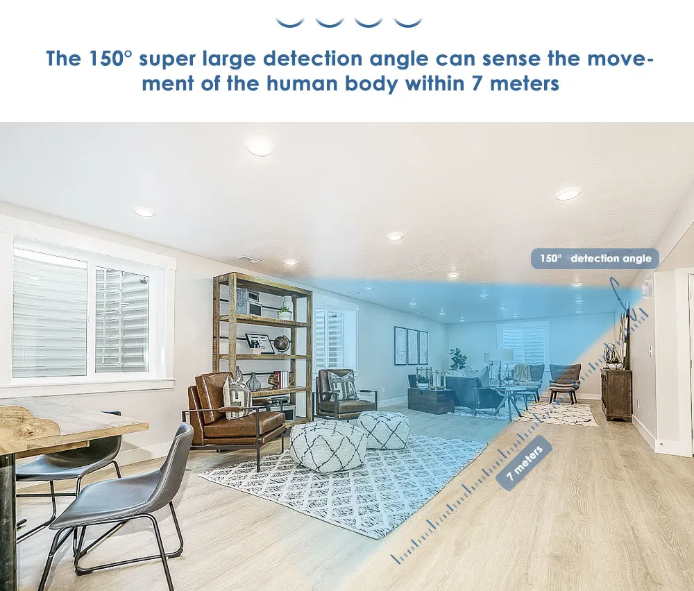 150 ° супер большой угол обнаружения может почувствовать движение человеческого тела в пределах 7 метров,