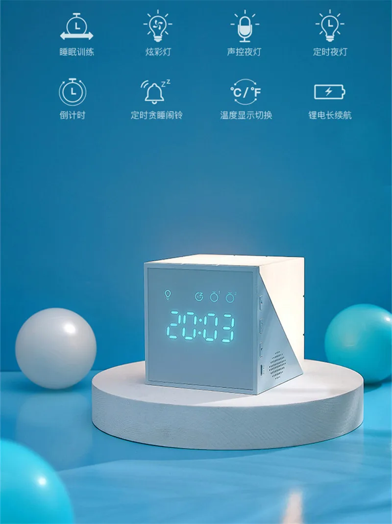 Материал изделия: АБС-пластик + Поликарбонат Размер изделия: 187*187*187 (мм) Номинальная мощность: 1,25 W Ток зарядки: 300 мА Номинальное напряжение: DC5V Функция часов: обучение сна/цветной светильник s/Ночной светильник с голосовым управлением/приуроченный Ночной светильник/Обратный отсчет/таймер повтора/Будильник/термометр переключатель дисплея/длительный срок службы батареи