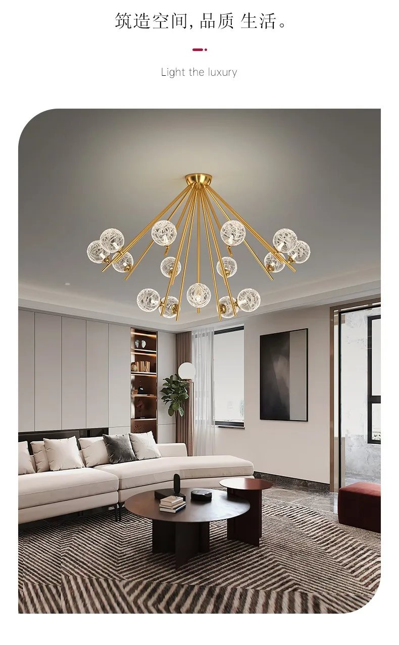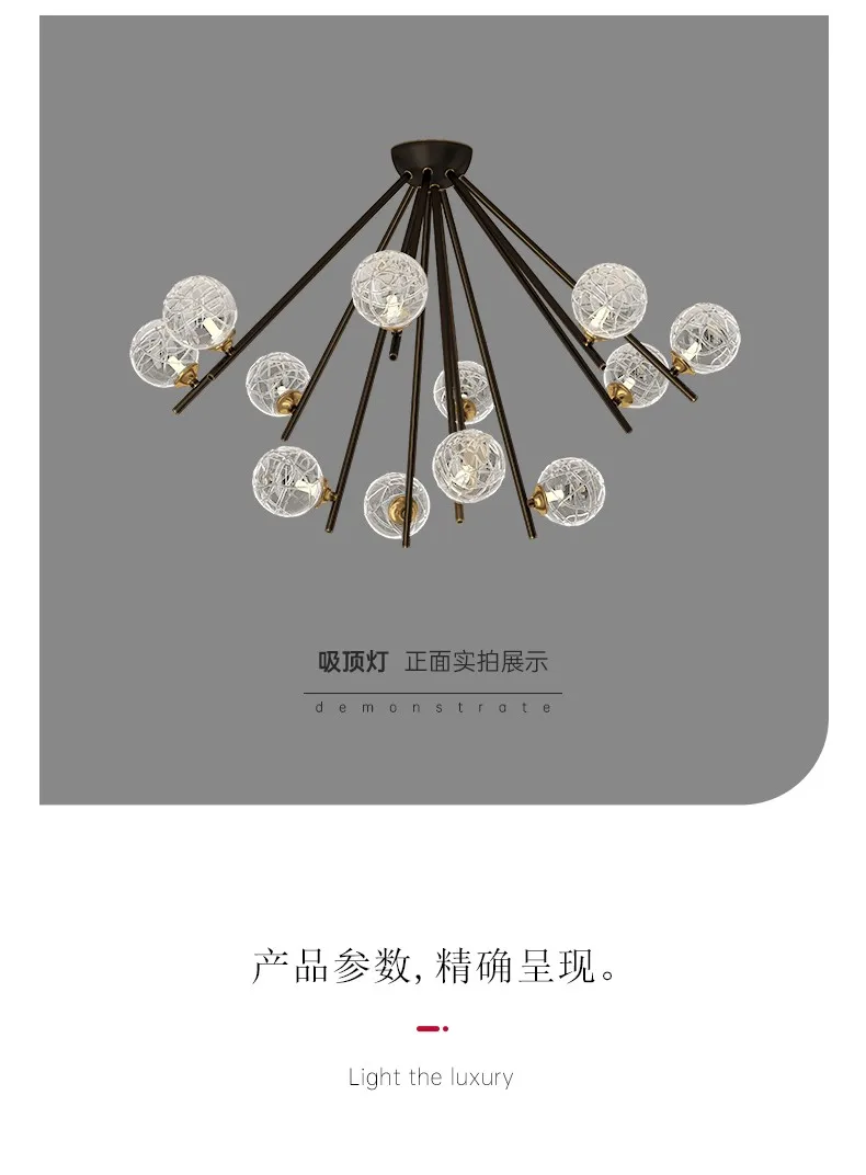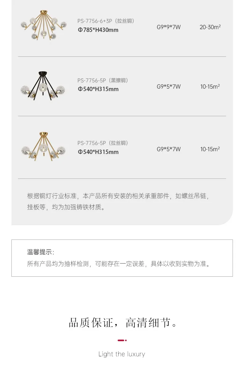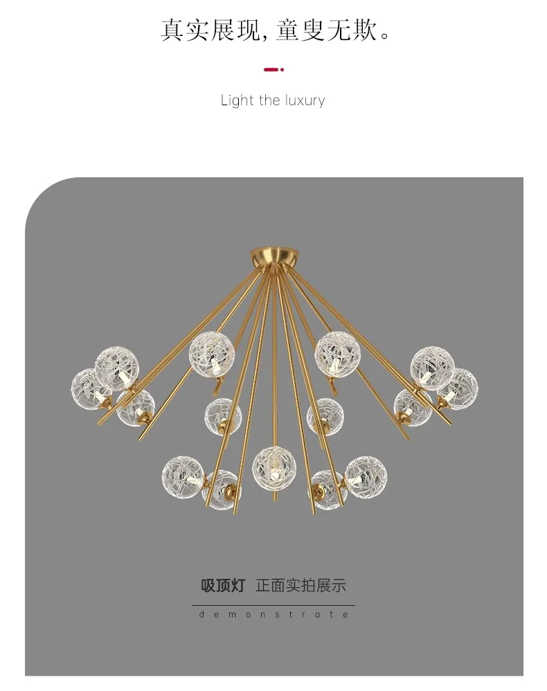 Корпус лампы: золотистый/черный + прозрачный Материал: медь + стекло Светильник источник: G9 Подходит для: гостиной, столовой, спальни, виллы, лобби Размер: 5 головок-D54 * h31,5 см 9 головок-D78.5 * H43cm 12 головок-D90 * h50 см 15 головок-D100 * h57см (Сменные: Есть три цветовых температуры, которые можно переключать (Теплый светильник, нейтральный светильник, холодный белый светильник). Через настенный выключатель, непрерывное включение и выключение для переключения цветовой температуры.)
