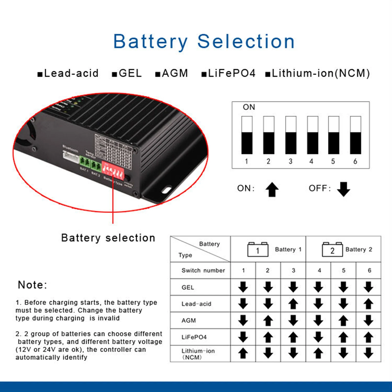 2. Пять типов батарей могут быть выбраны Через DIP-переключатель. Гелевая батарея, свинцово-кислотная батарея, AGM, литий-железо-фосфатная батарея и тройная литиевая батарея.