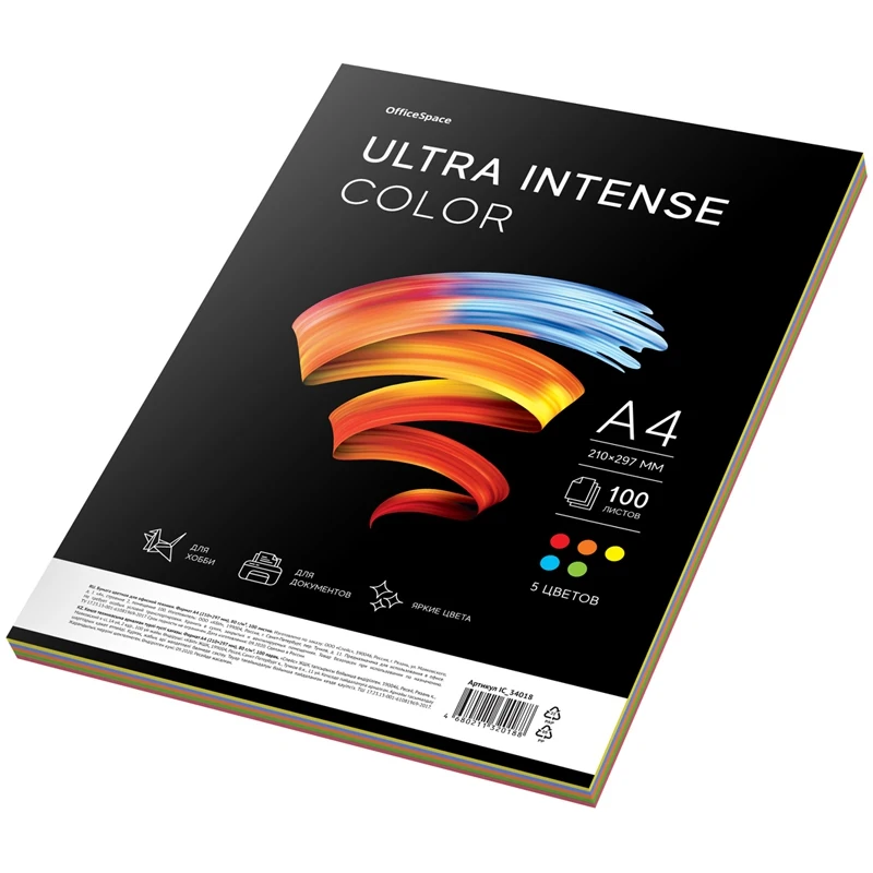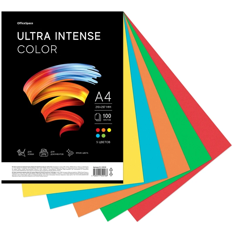 A4 color paper. Paper density 80 g/m?. Packed in a transparent bag with a reusable valve of 100 sheets. Assorted of 5 bright intensive colors: red, green, orange, blue and yellow. Paper can be used for printing documents, advertising and information ads, postcards and invitation cards, as well as for children's creativity.