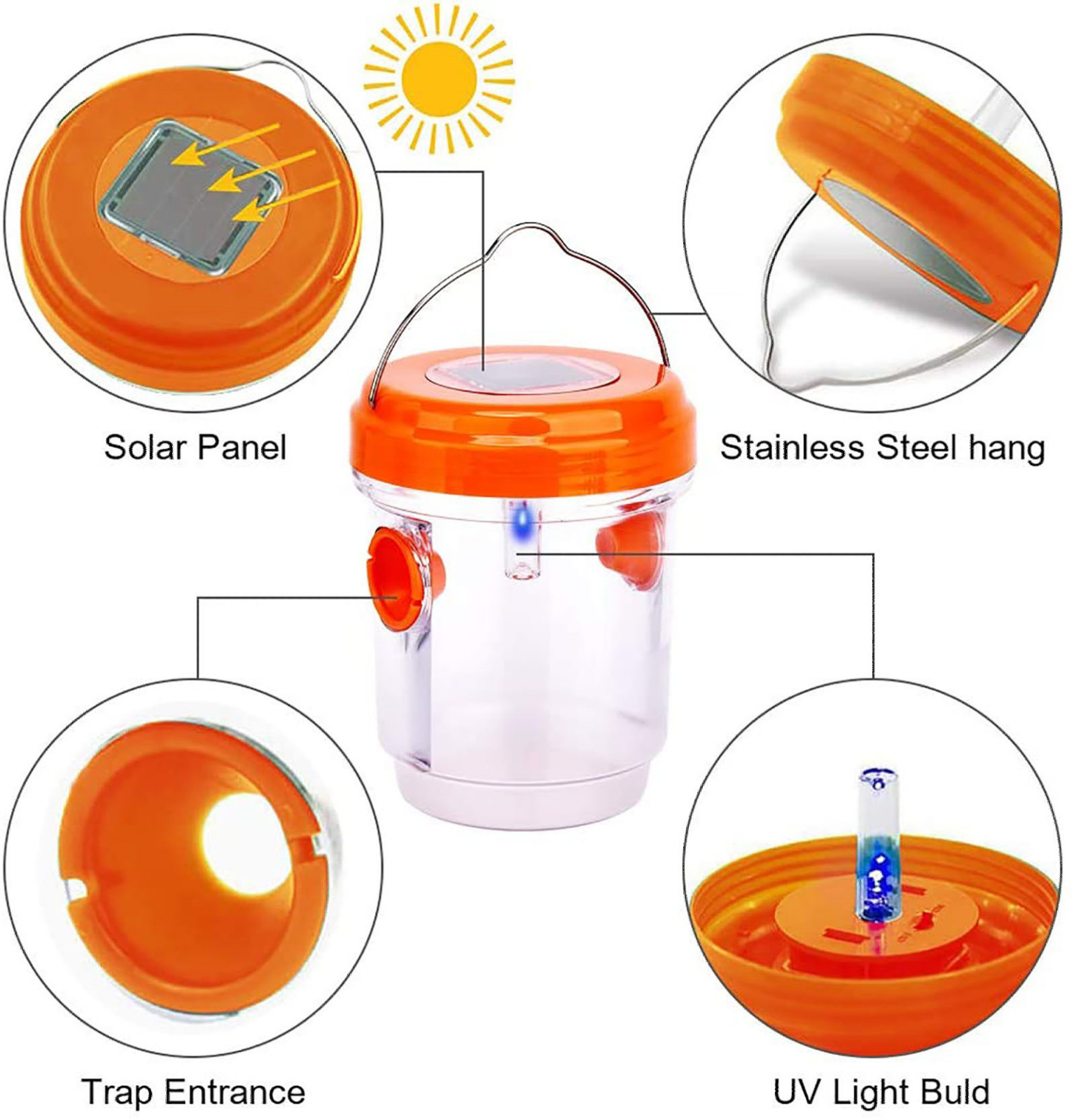 Солнечная батарея УФ-светильник. Включение выключения на задней части крышки ловушки, УФ-светильник Автоматически включается ночью и генерирует теплое голубое свечение, чтобы заманить Насекомые. Заряжается от солнечного света в течение дня, тем самым обеспечивая Непрерывный контроль