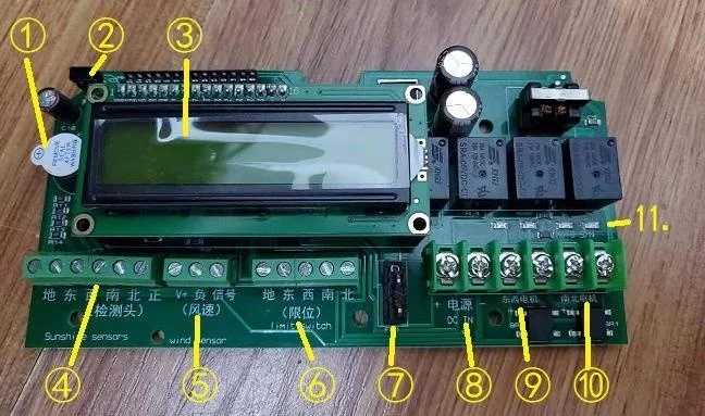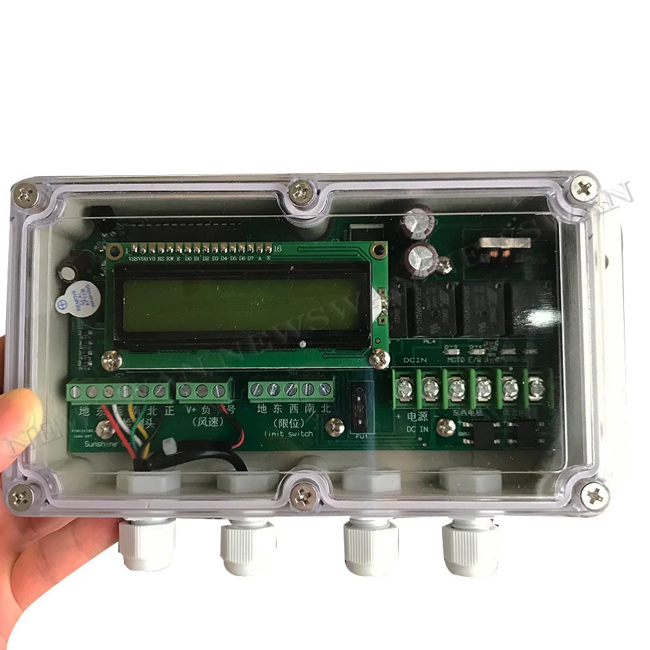 Блок управления оснащен водонепроницаемым корпусом с прозрачной верхней крышкой и имеет схему, состоящую из MCU, LCD и других компонентов. Пятиядерный сигнал, введенный головкой обнаружения, оценивается по встроенной программе цепи. В соответствии с соответствующей ситуацией производится соответствующее исполнение вождения. Его интерфейсы-это пятиядерный сигнал головки обнаружения, сигнал датчика скорости ветра, беспроводной сигнал дистанционного управления, вход питания и выход мотора оси Восток-Запад. Выходная мощность двигателя с северным и южным осями и т. Д.