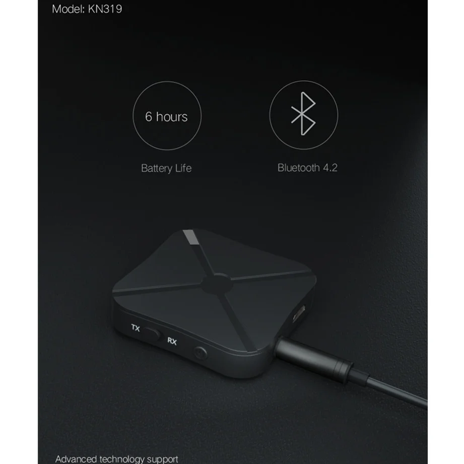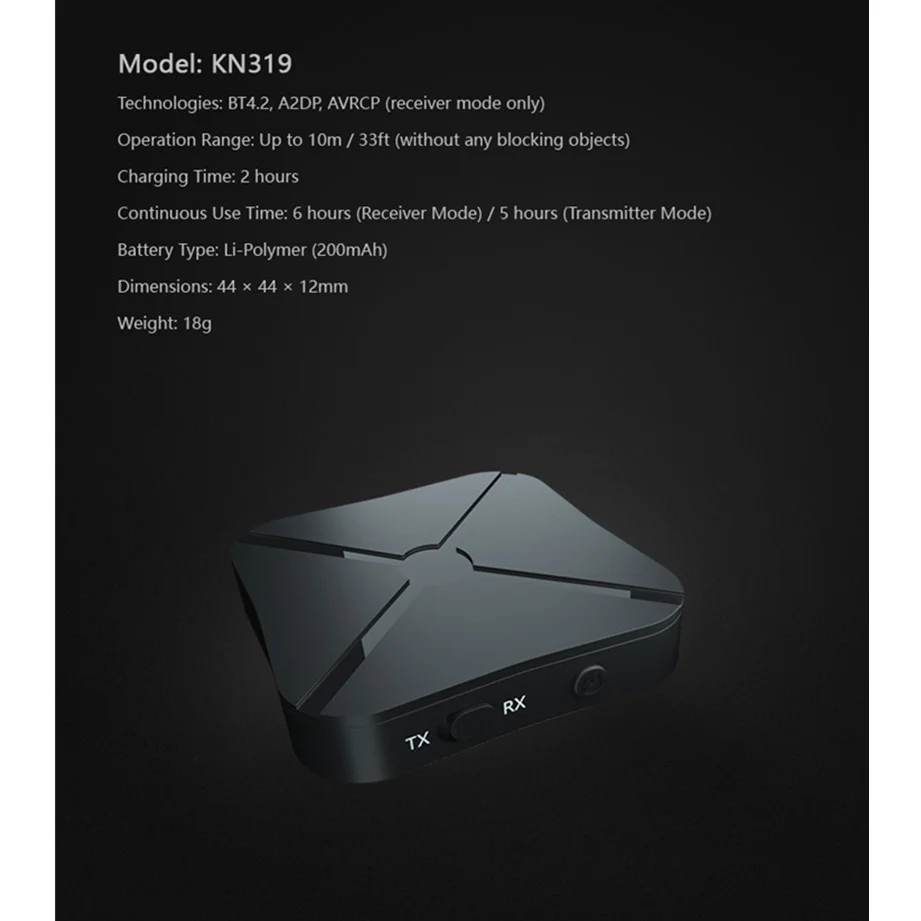 Package Content: 1x Bluetooth Audio Transmitter/Receiver Adapter(KN319) 1x Micro USB Power Cable 1x RCA Cable 1x 3.5mm Aux Cable 1x User Manual Specifications: Model: KN319 Operation Range: Up to 10m / 33ft (without any blocking objects) Pairing name:KN319 Charging Time: 2 hours Working Time: RX:6 hours ; TX:5 hours Battery Type: Li-Polymer (200mAh) Dimensions: 44 × 44 × 12mm Weight: 18g