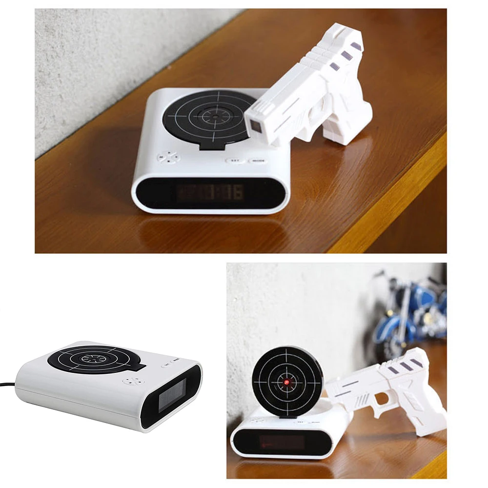 Целевые часы имеют два режима. Обычный режим позволяет остановить звук будильника, нажав кнопку или наведите цель с помощью инфракрасного пистолета. Жесткий режим поддерживает только остановку звукового сигнала при нажатии кнопки. Вы можете выбрать режимы в соответствии с вашей практичной ситуацией.