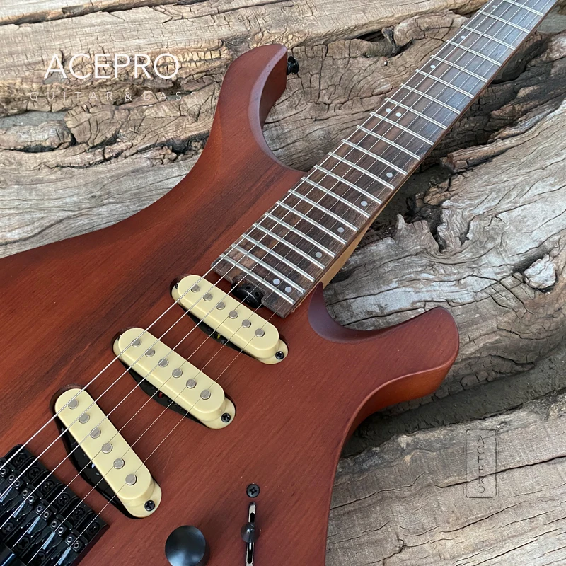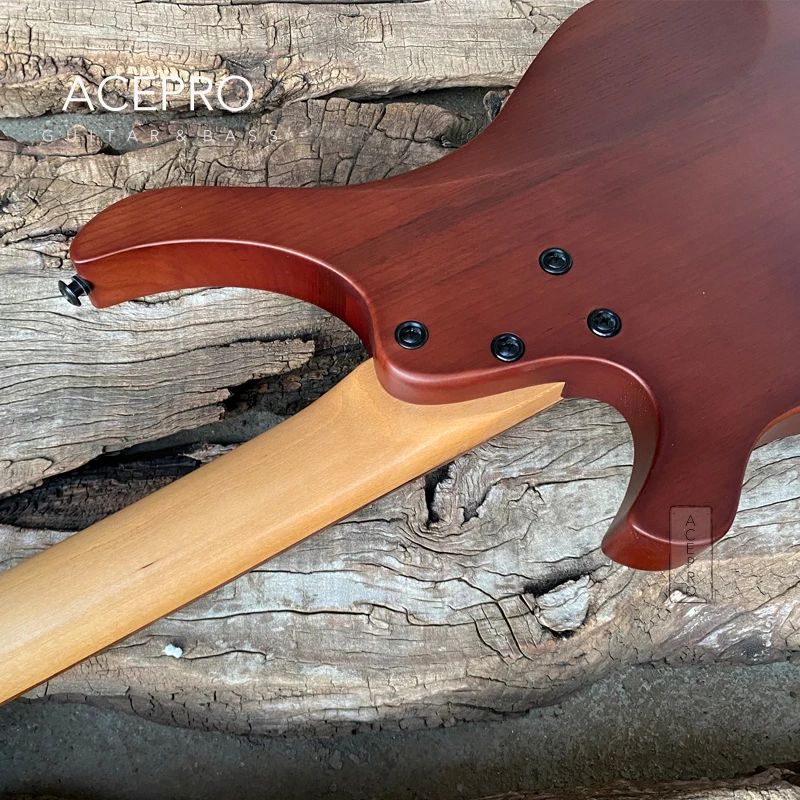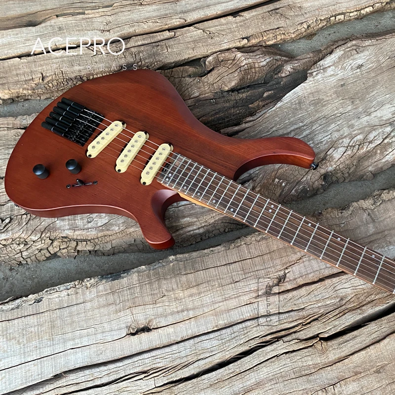 Acepro новый стиль безголовая электрогитара, жареная Кленовая шея, атласная коричневая пепельная основа, 3 одиночные звукосниматели, черная фурнитура, 24 лада