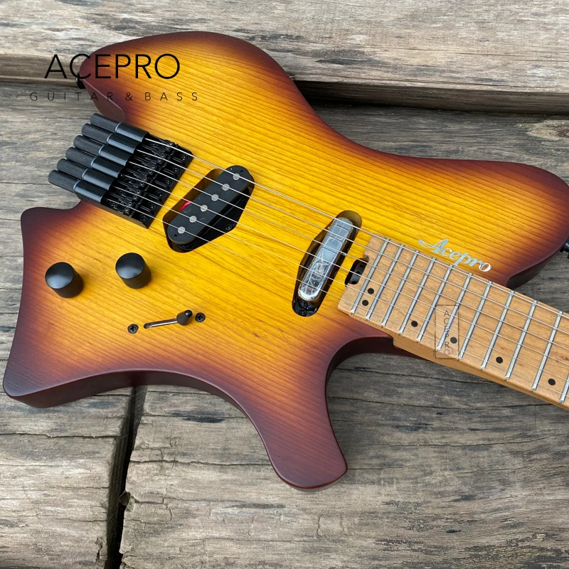 Acepro новый стиль безголовая электрогитара, жареная Кленовая горловина, атласная винтажная Солнечная расцветка пепельного тела, высокое качество мост, черное оборудование, 24 лада